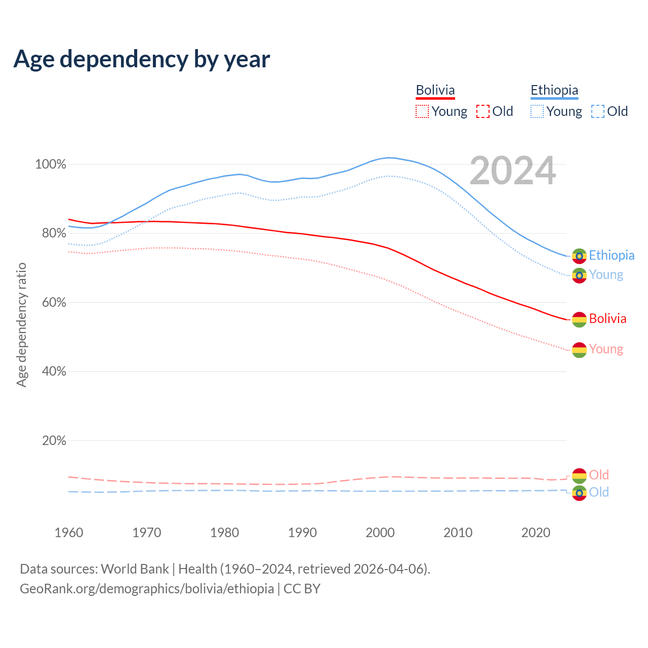 - The share of old-age demographic (65+) in Bolivia is 5.64% vs 3.23% in Ethiopia.