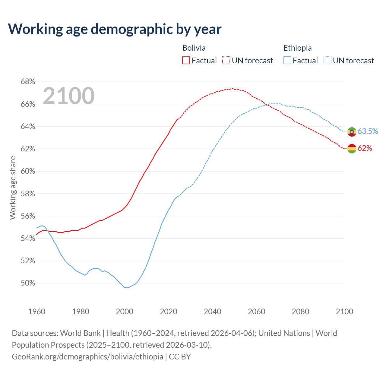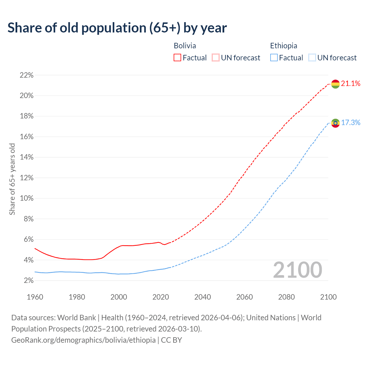 The share of older people aged 65 and over is 5.64% in Bolivia and 3.23% in Ethiopia. Life expectancy in Bolivia compared to Ethiopia .