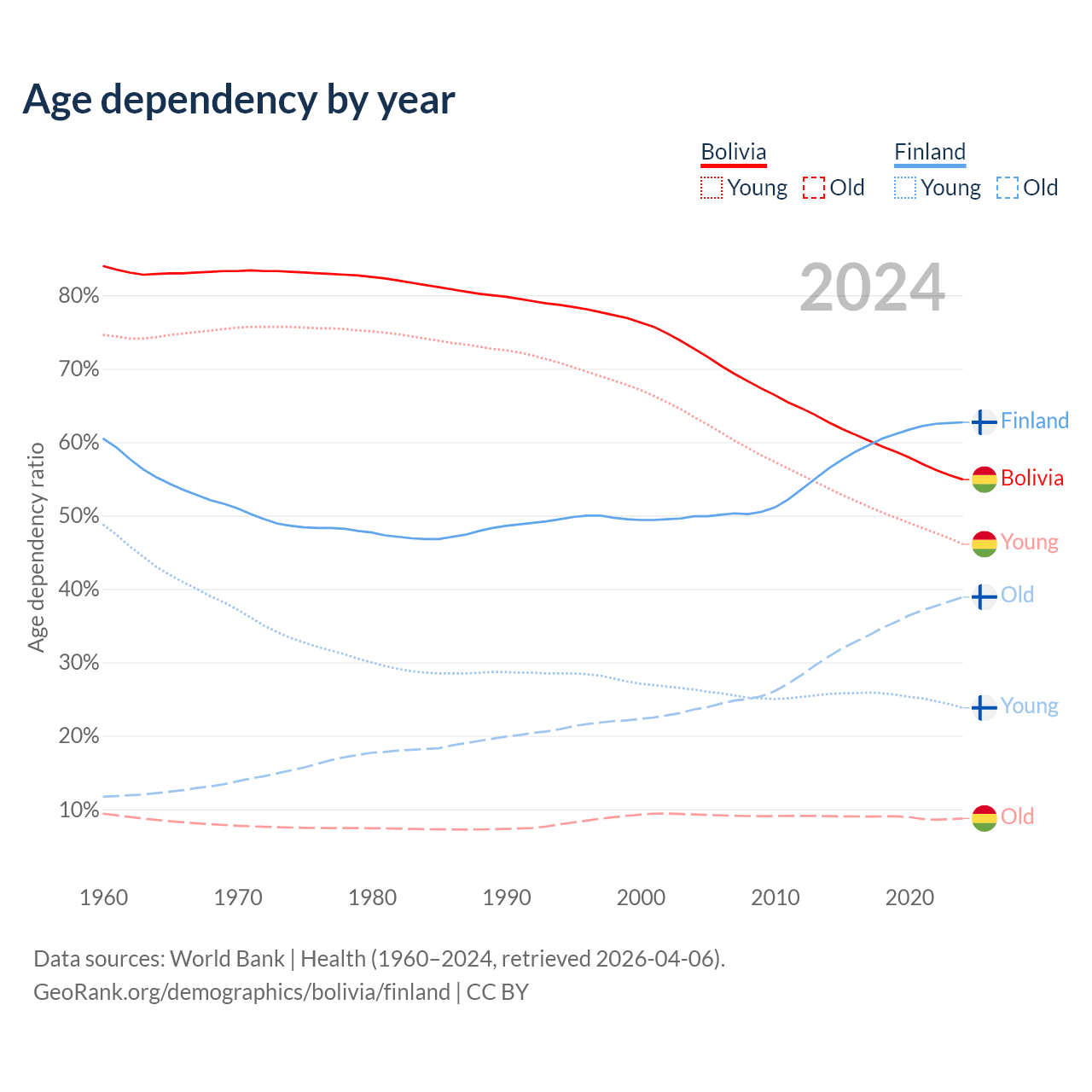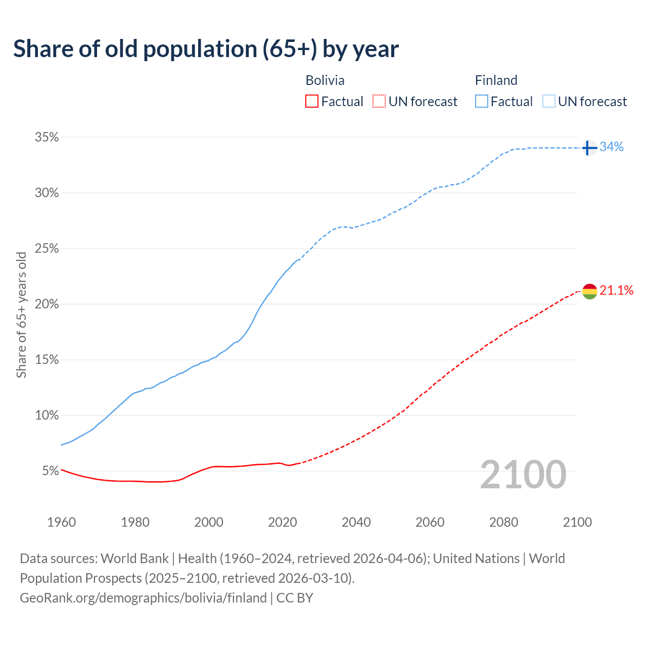 The share of older people aged 65 and over is 5.64% in Bolivia and 23.9% in Finland. Life expectancy in Bolivia compared to Finland .