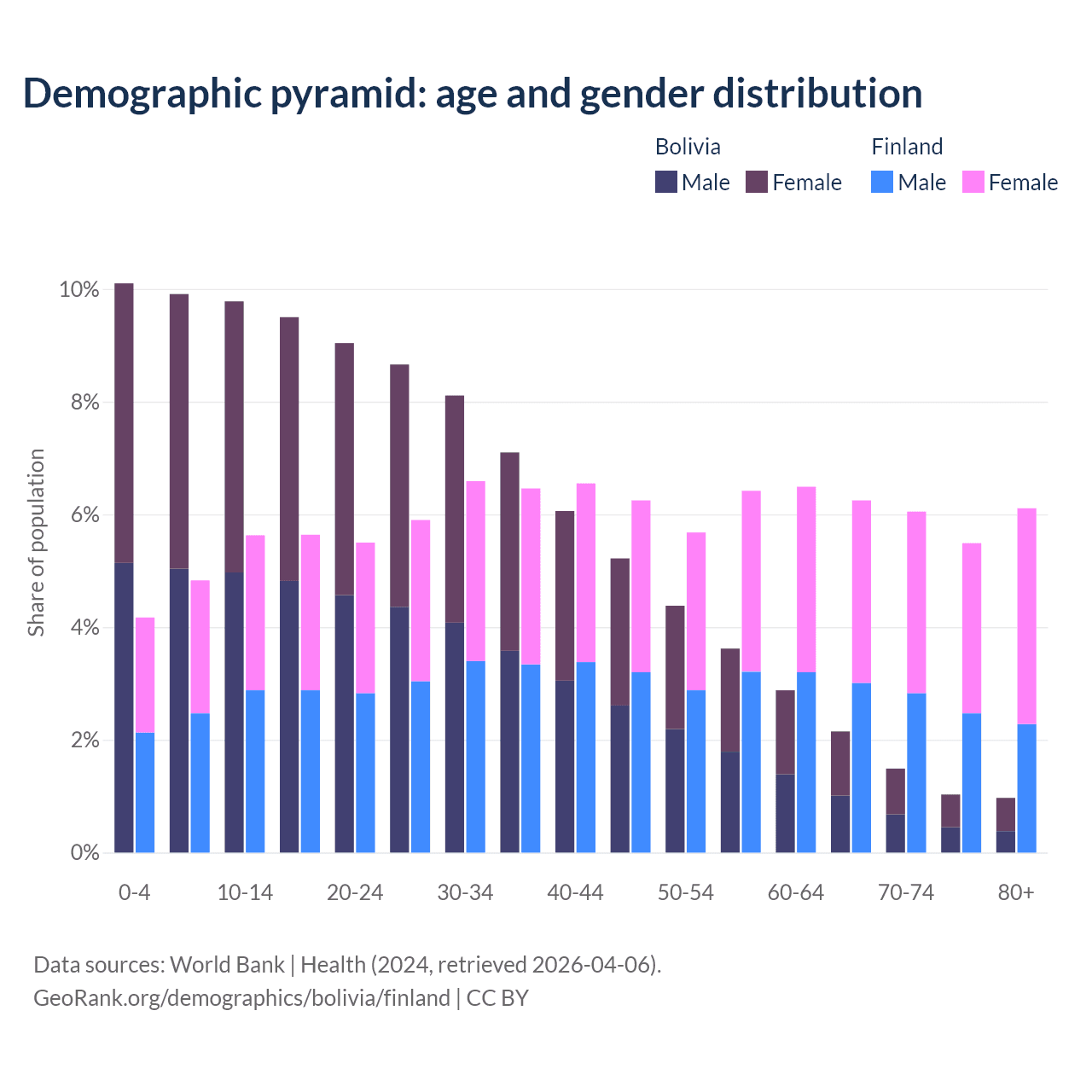 - The share of old-age demographic (65+) in Bolivia is 5.64% vs 23.9% in Finland.
