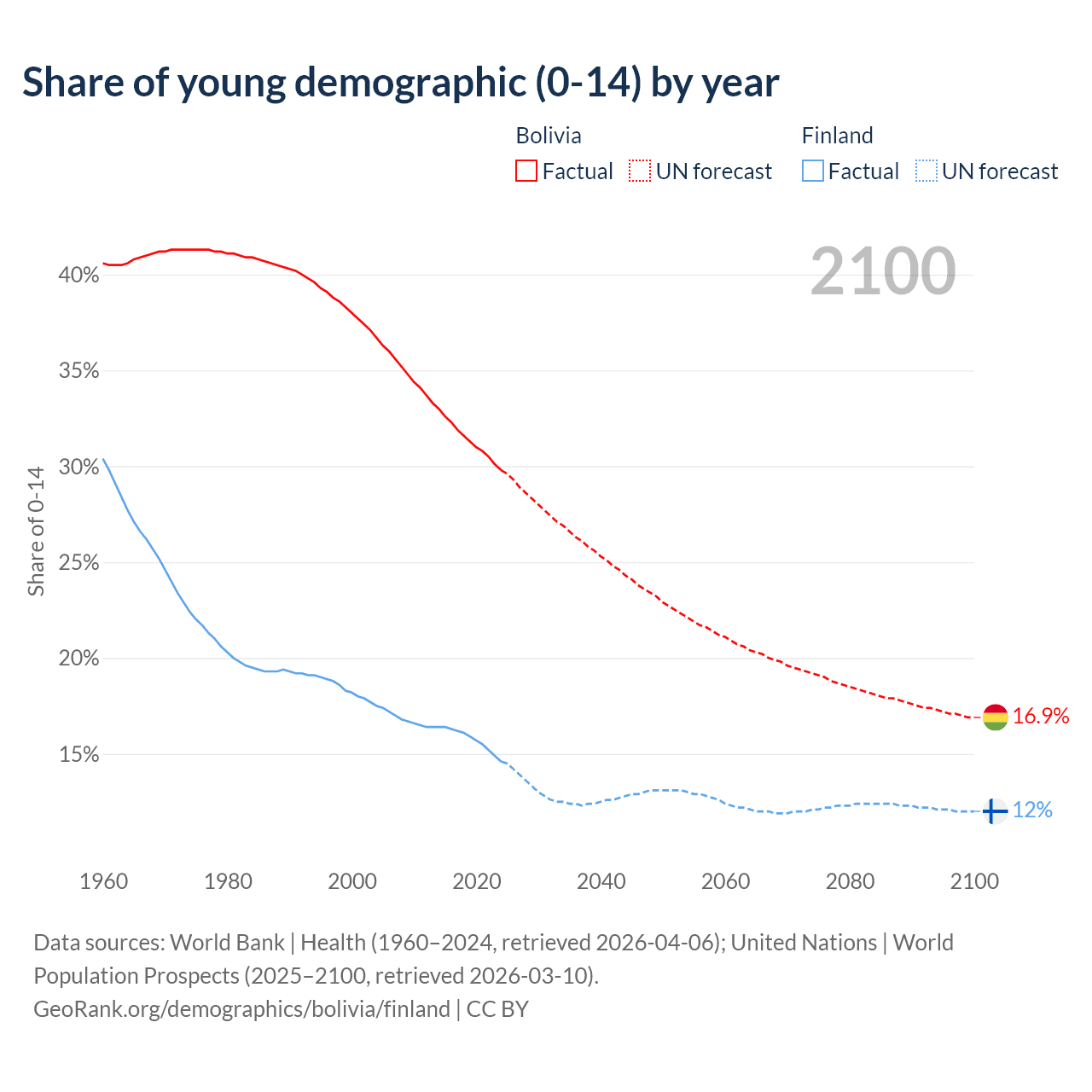 - The share of young demographic (0-15 years old) in Bolivia is 29.8% vs 14.6% in Finland.