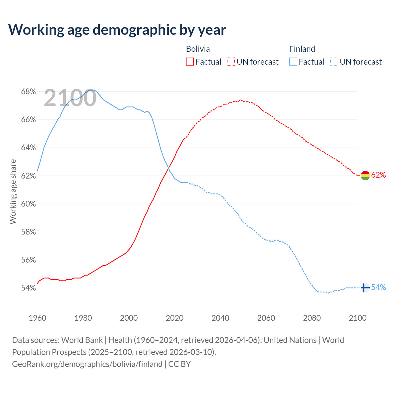 Median age Bolivia vs Finland, 1960-2100