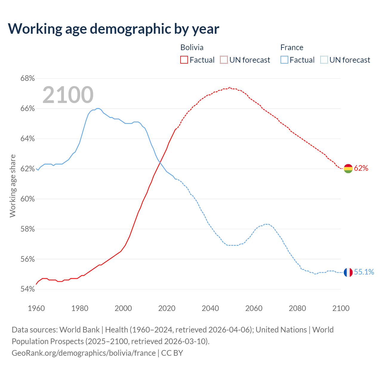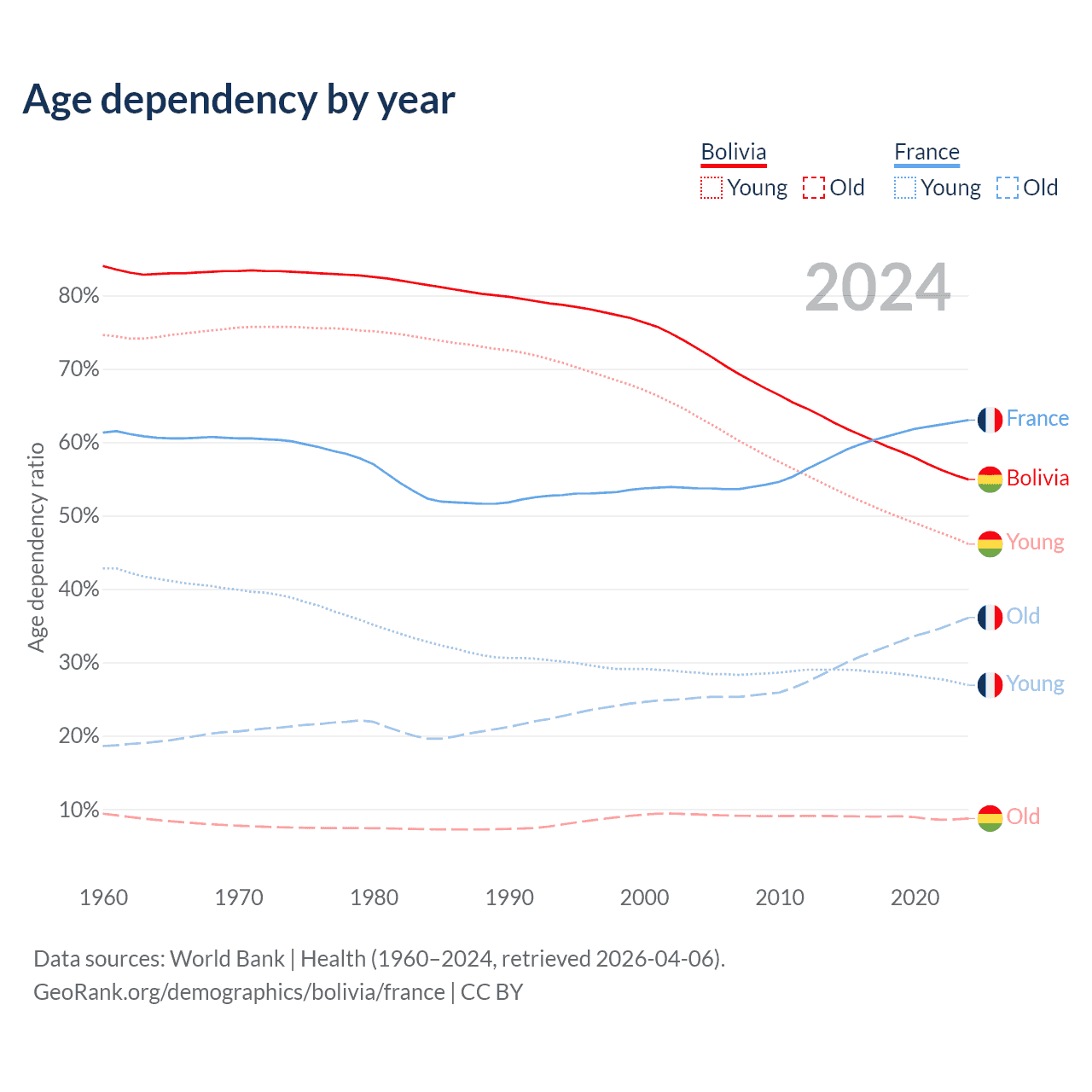 - The share of old-age demographic (65+) in Bolivia is 5.64% vs 22.1% in France.