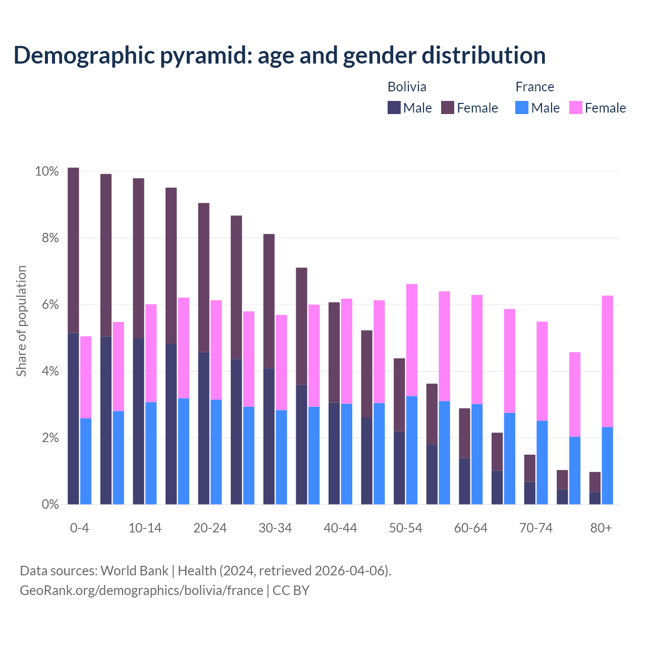 - Bolivia is ranked 128/196 by median age (oldest to youngest) vs 29/196 for France.
