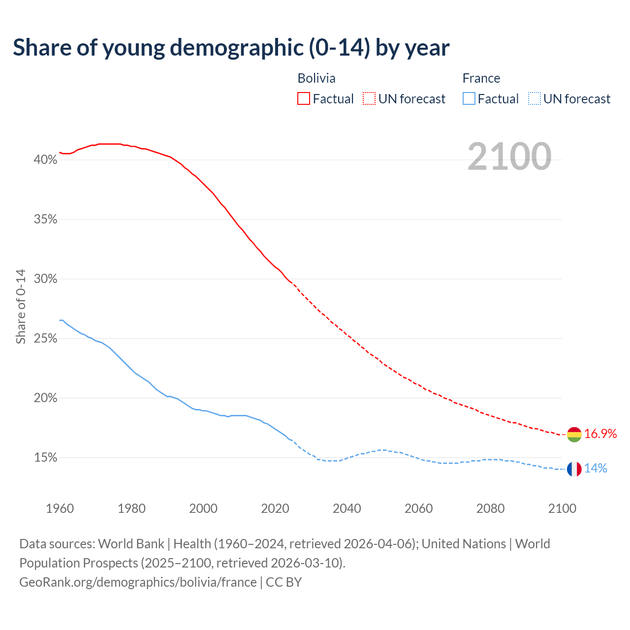 - The share of young demographic (0-15 years old) in Bolivia is 29.8% vs 16.5% in France.