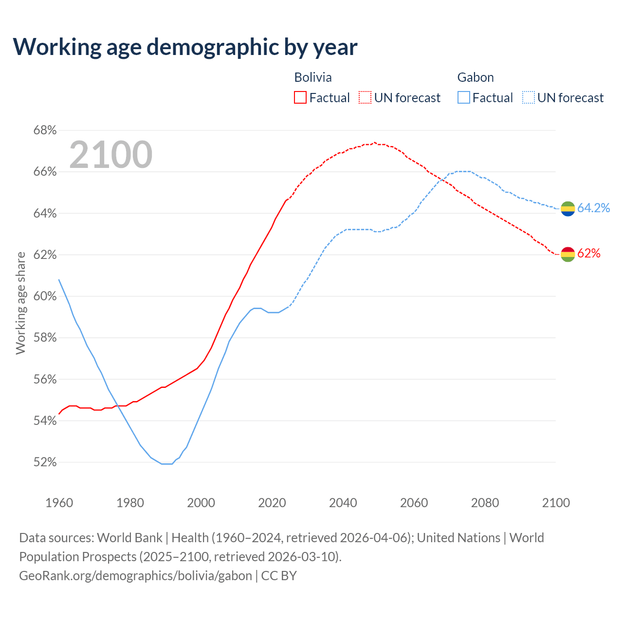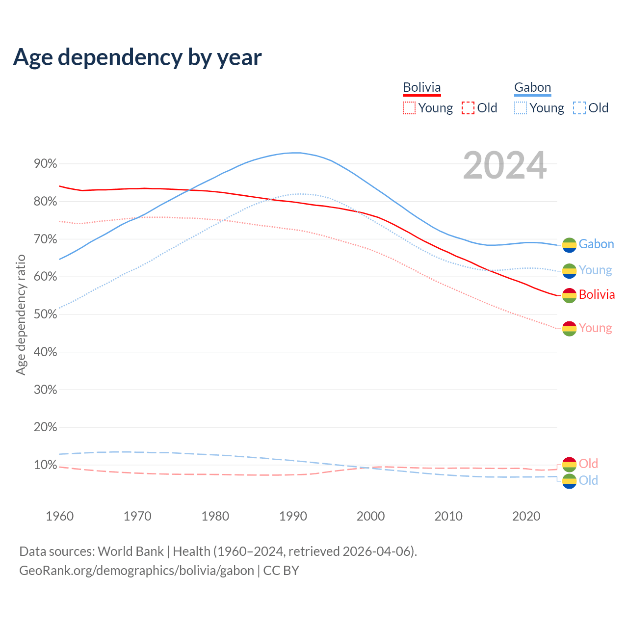 - The share of old-age demographic (65+) in Bolivia is 5.64% vs 4.08% in Gabon.