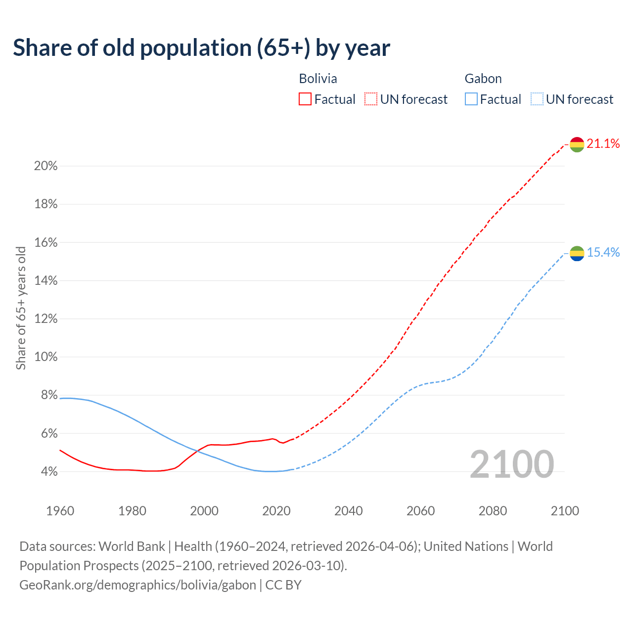 The share of older people aged 65 and over is 5.64% in Bolivia and 4.08% in Gabon. Life expectancy in Bolivia compared to Gabon .