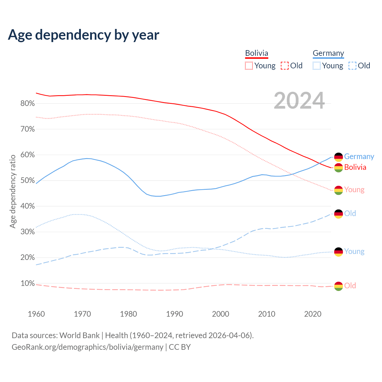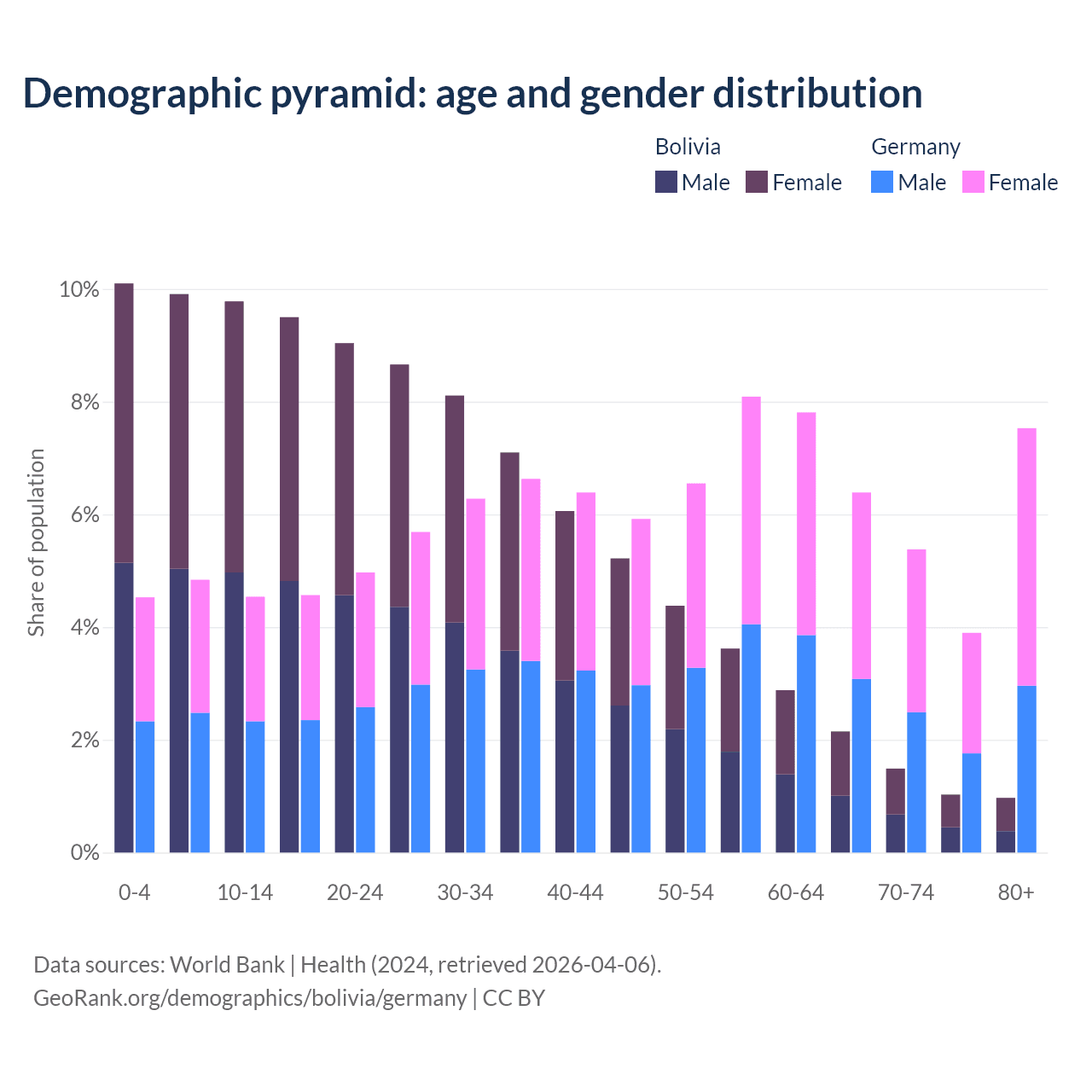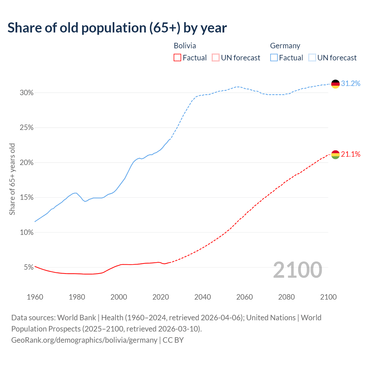 The share of older people aged 65 and over is 5.64% in Bolivia and 23.2% in Germany. Life expectancy in Bolivia compared to Germany .