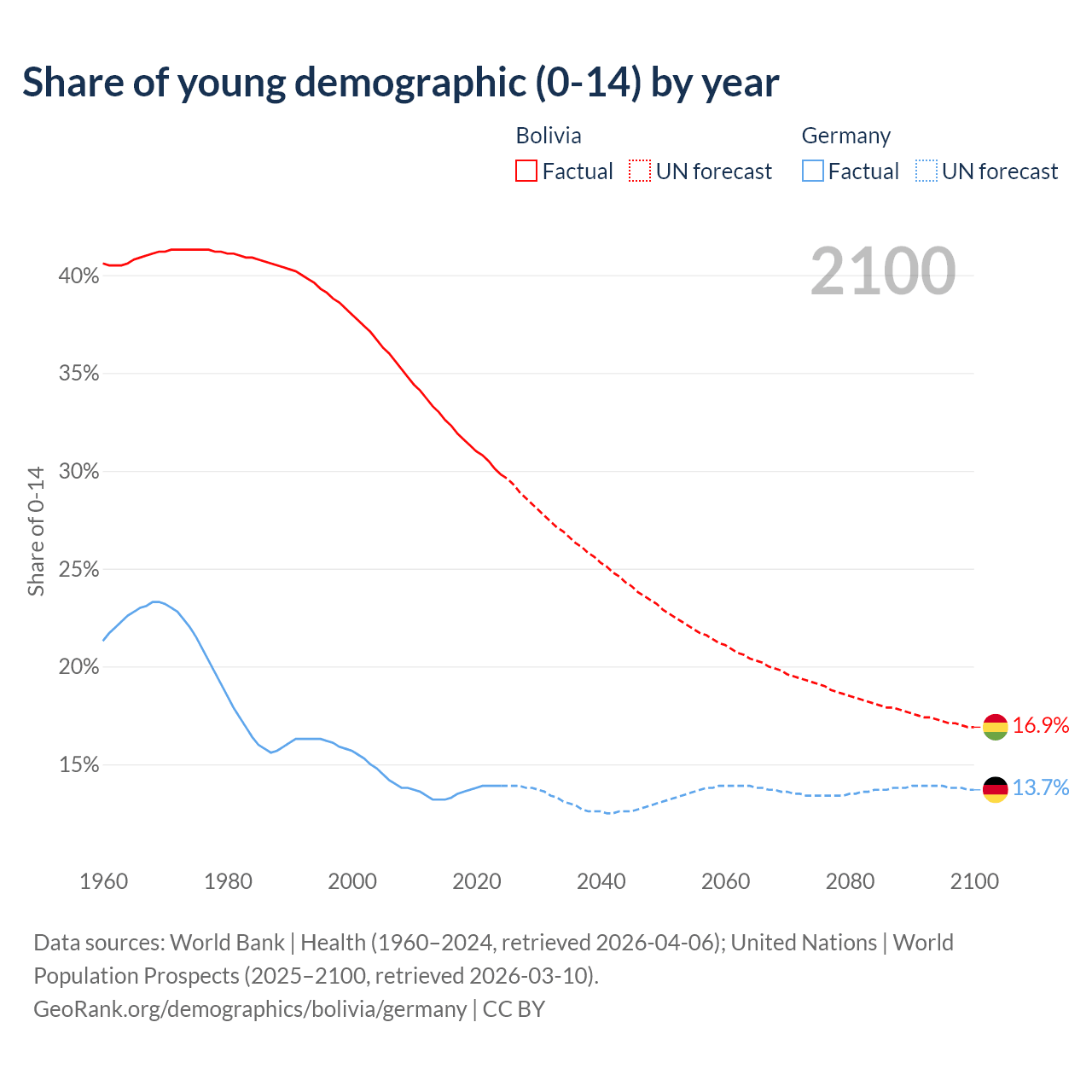 - The share of young demographic (0-15 years old) in Bolivia is 29.8% vs 13.9% in Germany.