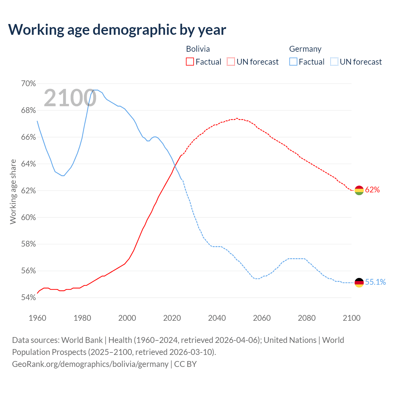 - Bolivia has 8.26M working age adults (aged 15-64) vs 51.9M in Germany.