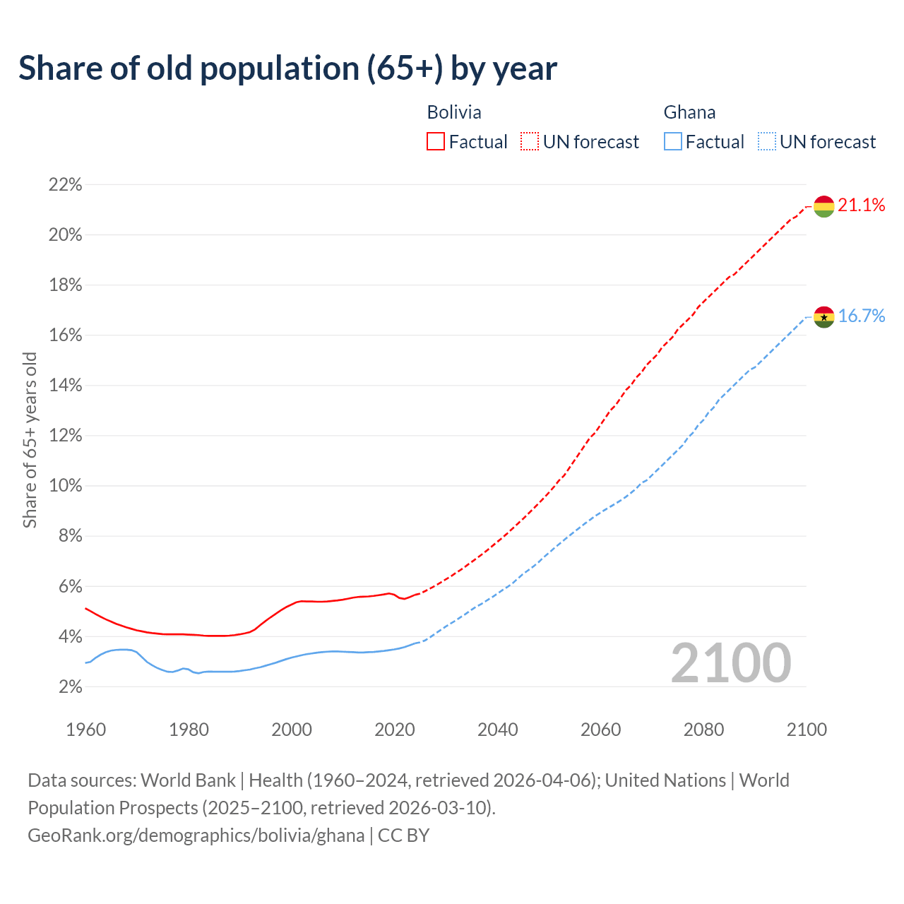 - The share of old-age demographic (65+) in Bolivia is 5.64% vs 3.71% in Ghana.