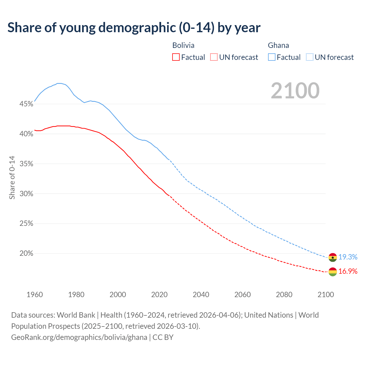 - The share of young demographic (0-15 years old) in Bolivia is 29.8% vs 35.8% in Ghana.