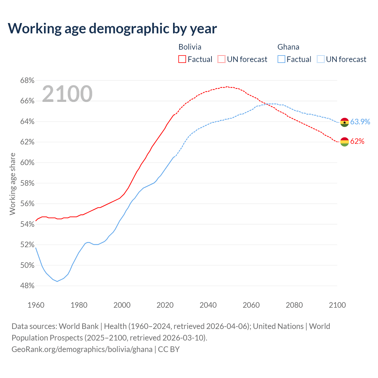 - Bolivia has 8.26M working age adults (aged 15-64) vs 21.7M in Ghana.