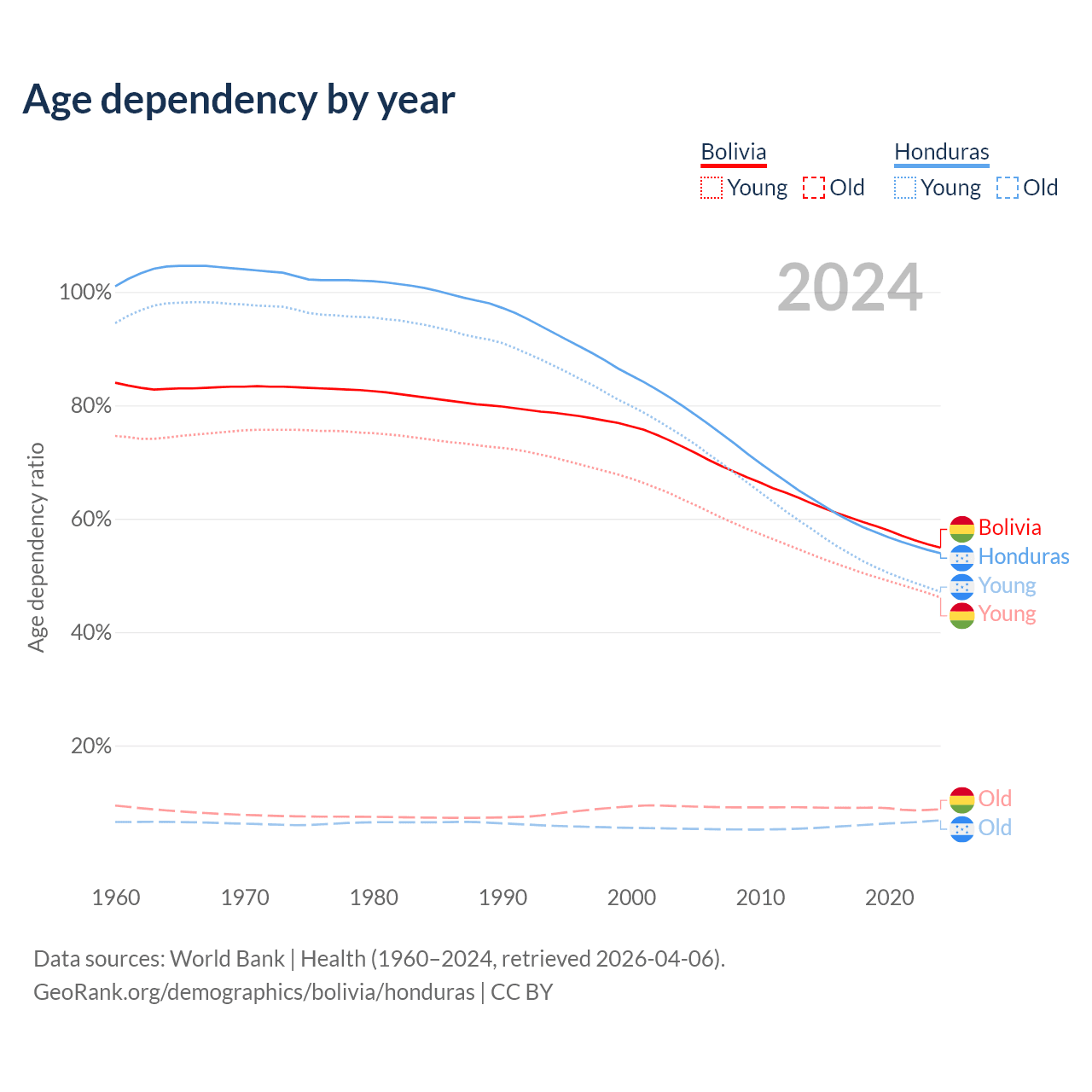 The share of older people aged 65 and over is 5.64% in Bolivia and 4.42% in Honduras. Life expectancy in Bolivia compared to Honduras .