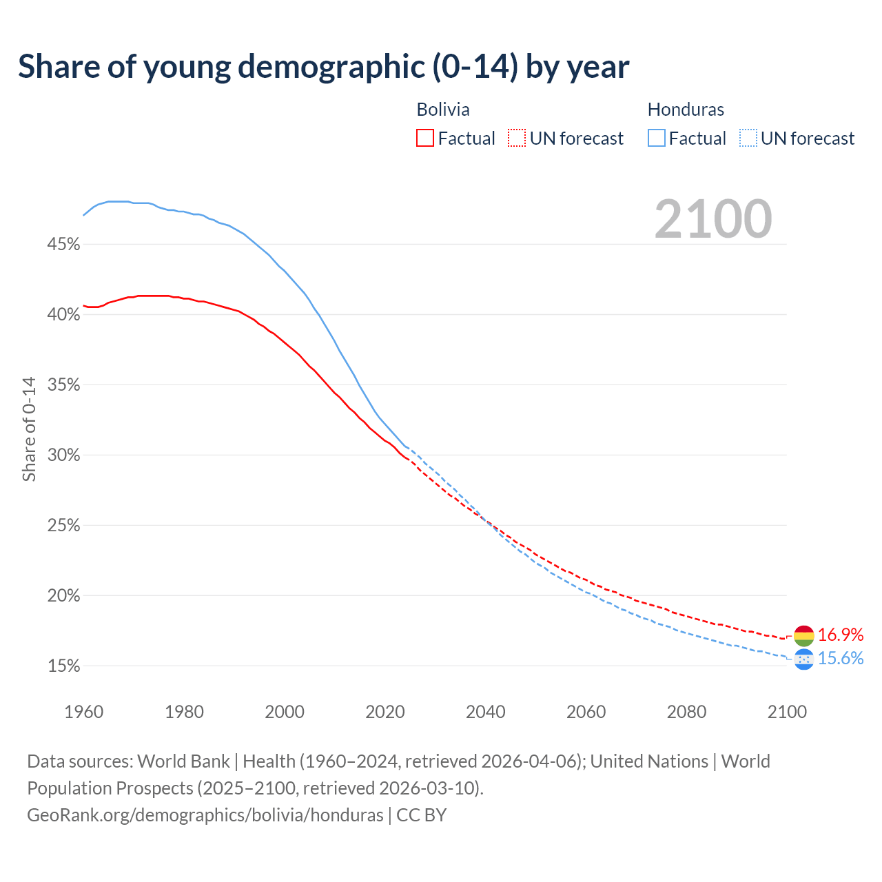 - The share of young demographic (0-15 years old) in Bolivia is 29.8% vs 30.6% in Honduras.