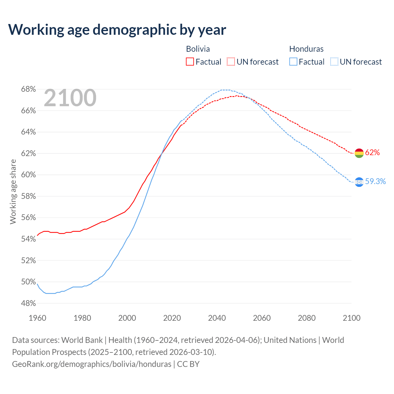 - Bolivia has 8.26M working age adults (aged 15-64) vs 7.3M in Honduras.