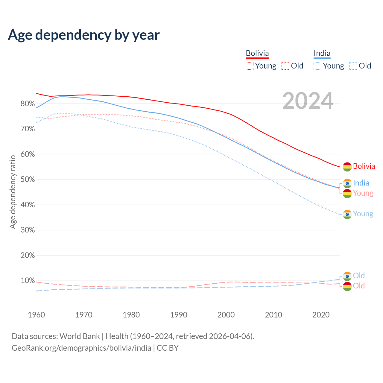 - Bolivia is ranked 128/196 by median age (oldest to youngest) vs 108/196 for India.