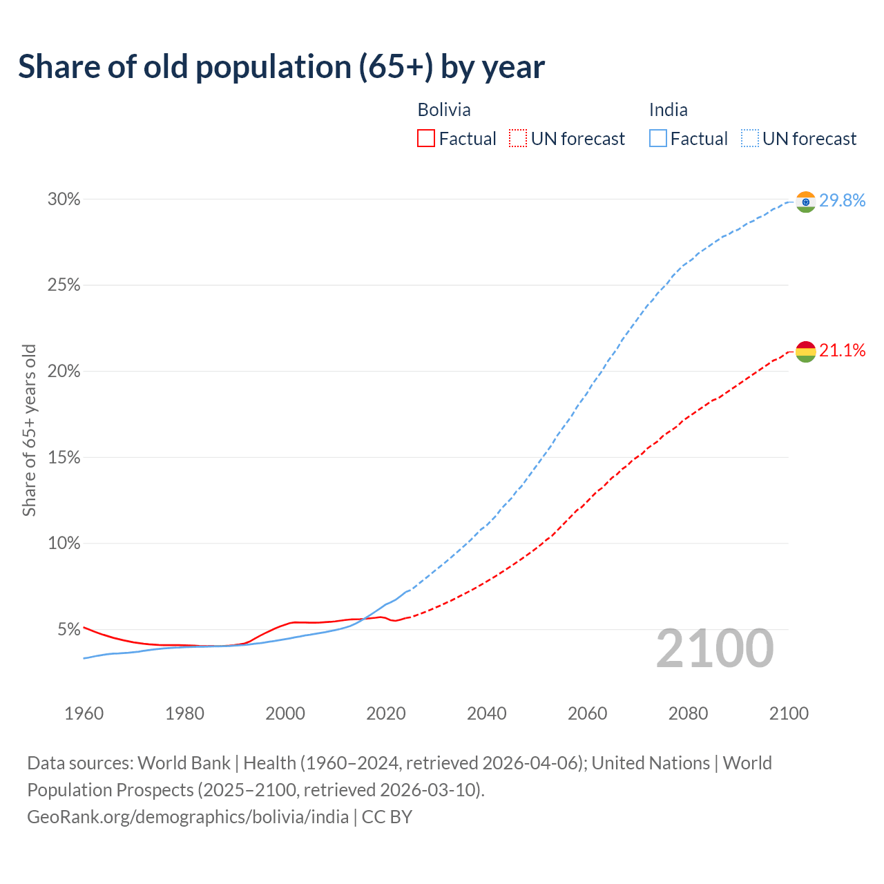 The share of older people aged 65 and over is 5.64% in Bolivia and 7.15% in India. Life expectancy in Bolivia compared to India .
