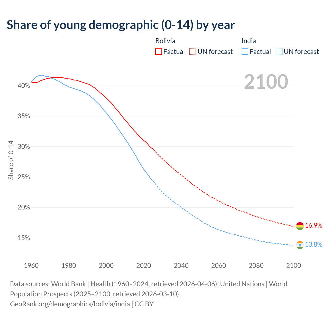 - The share of young demographic (0-15 years old) in Bolivia is 29.8% vs 24.6% in India.