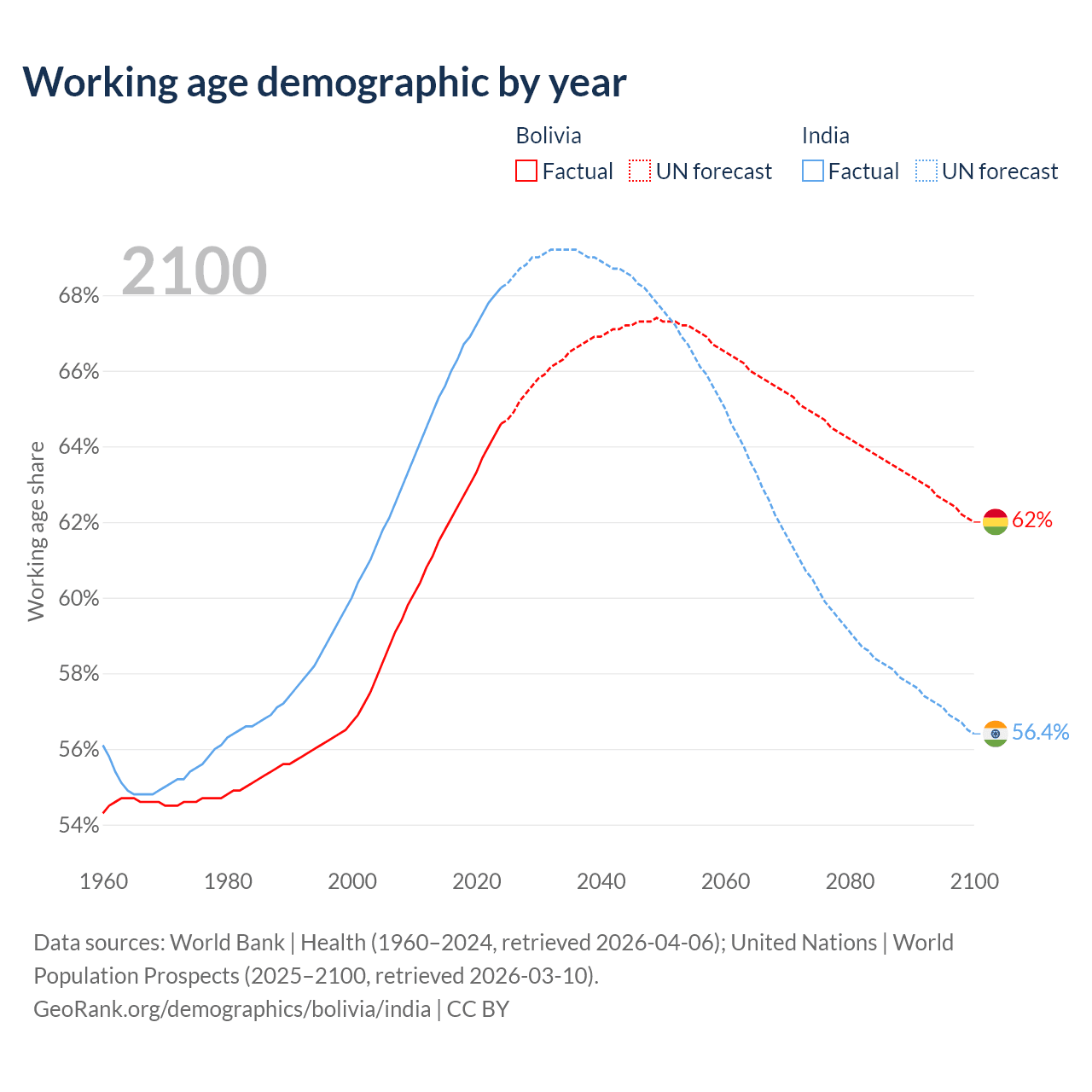 - Bolivia has 8.26M working age adults (aged 15-64) vs 1.01B in India.