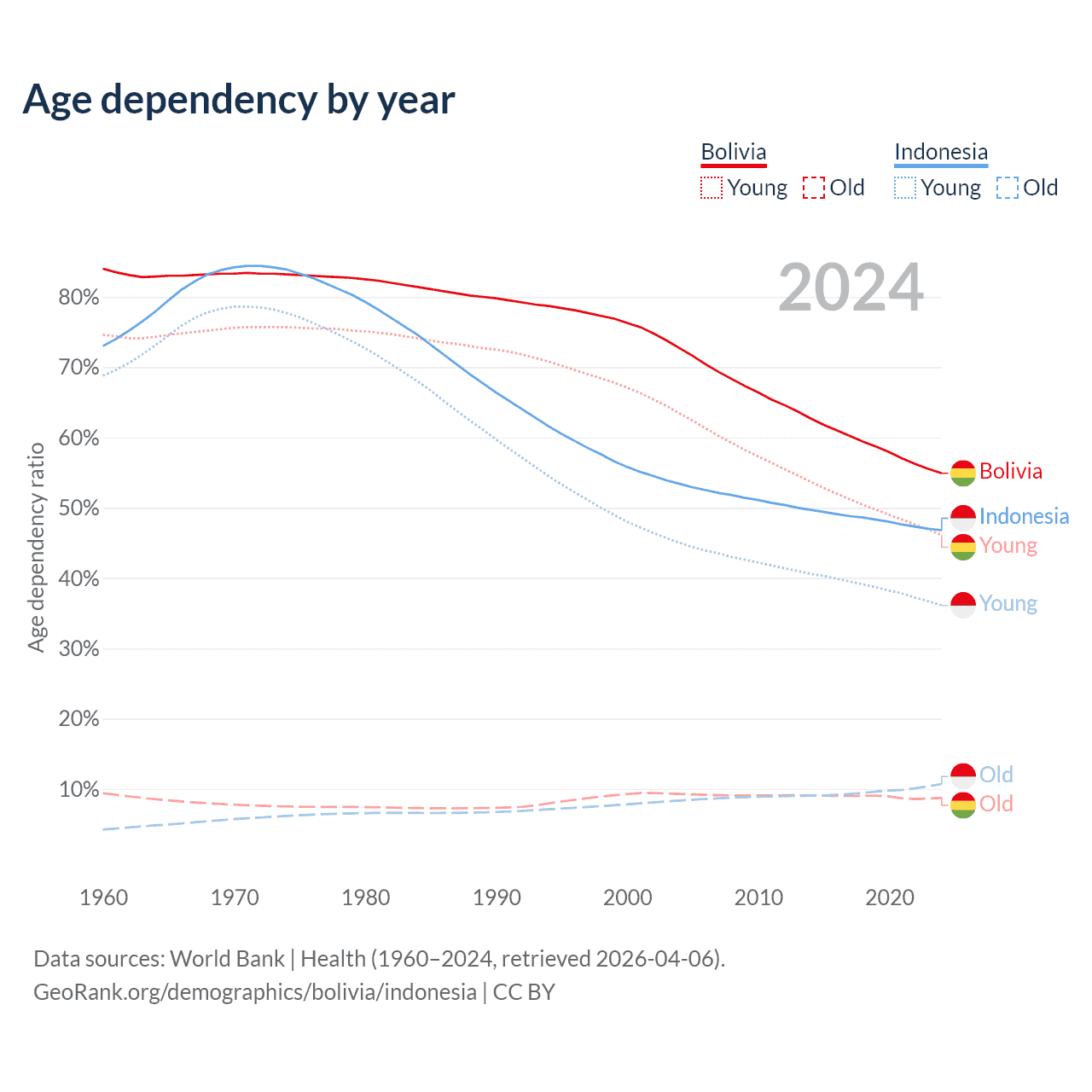 - Bolivia is ranked 128/196 by median age (oldest to youngest) vs 93/196 for Indonesia.