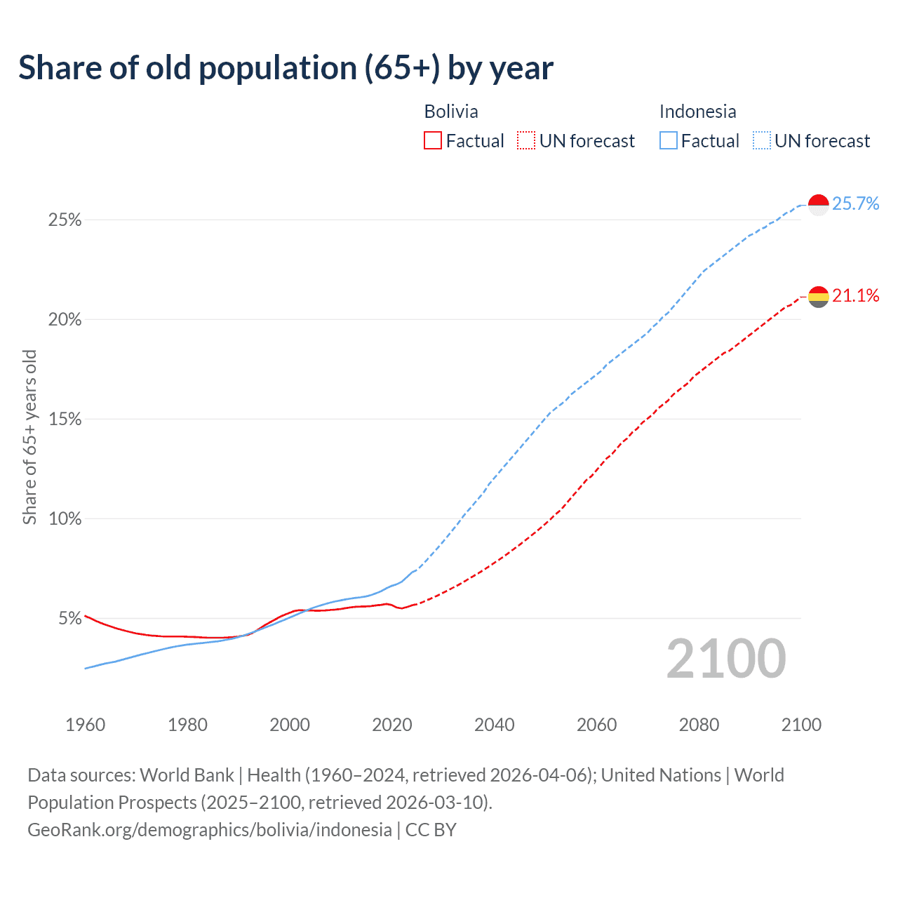 The share of older people aged 65 and over is 5.64% in Bolivia and 7.29% in Indonesia. Life expectancy in Bolivia compared to Indonesia .