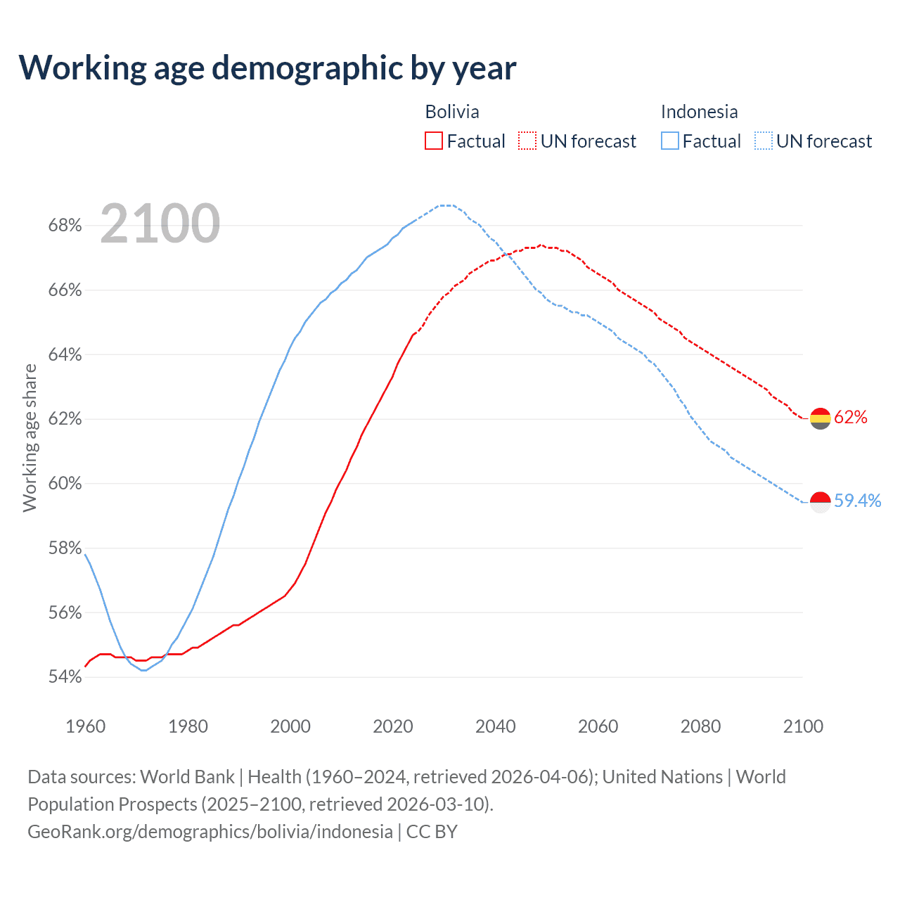 Median age Bolivia vs Indonesia, 1960-2100