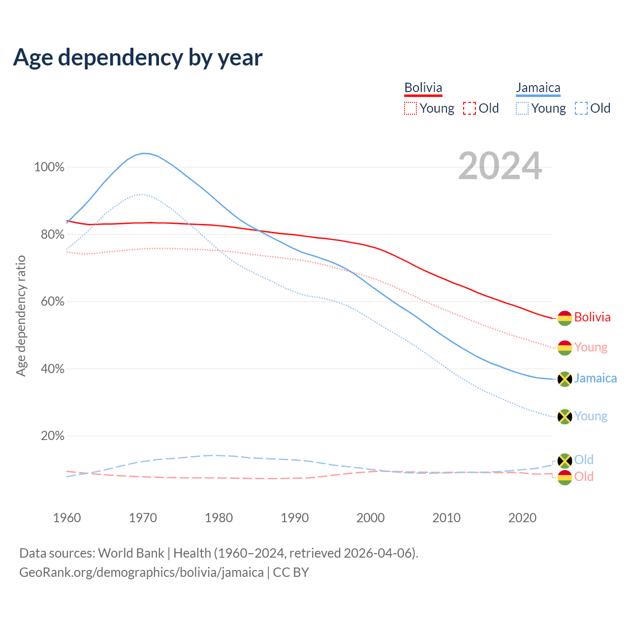 - The share of old-age demographic (65+) in Bolivia is 5.64% vs 8.21% in Jamaica.