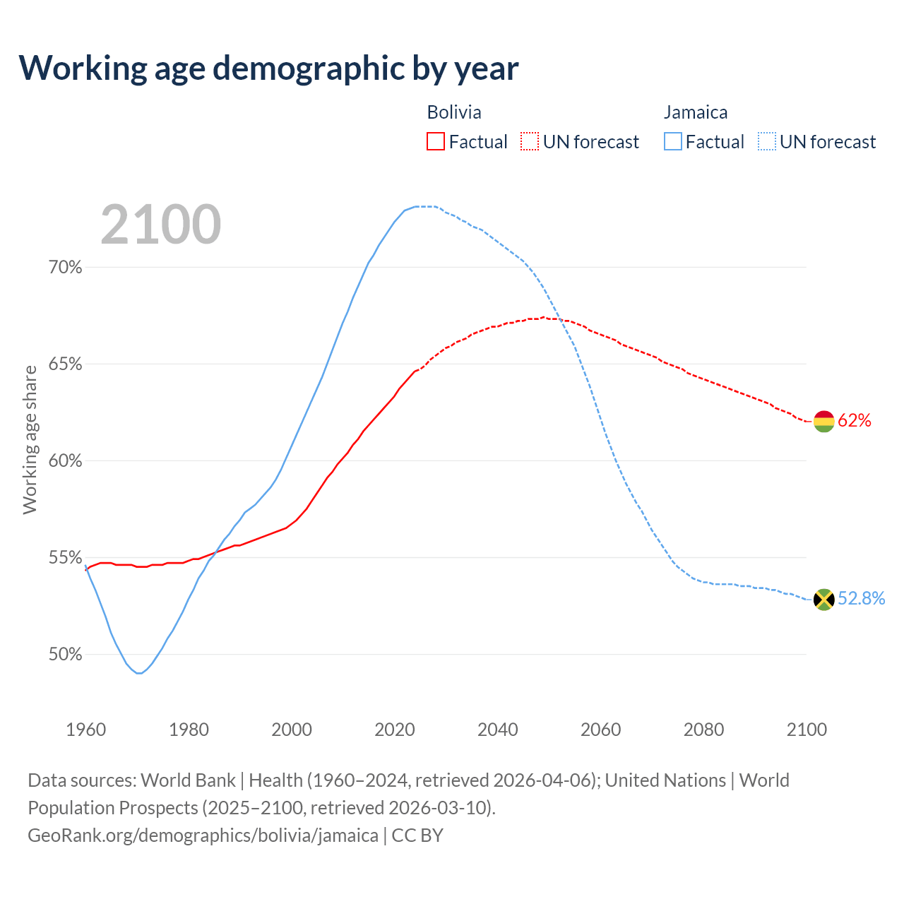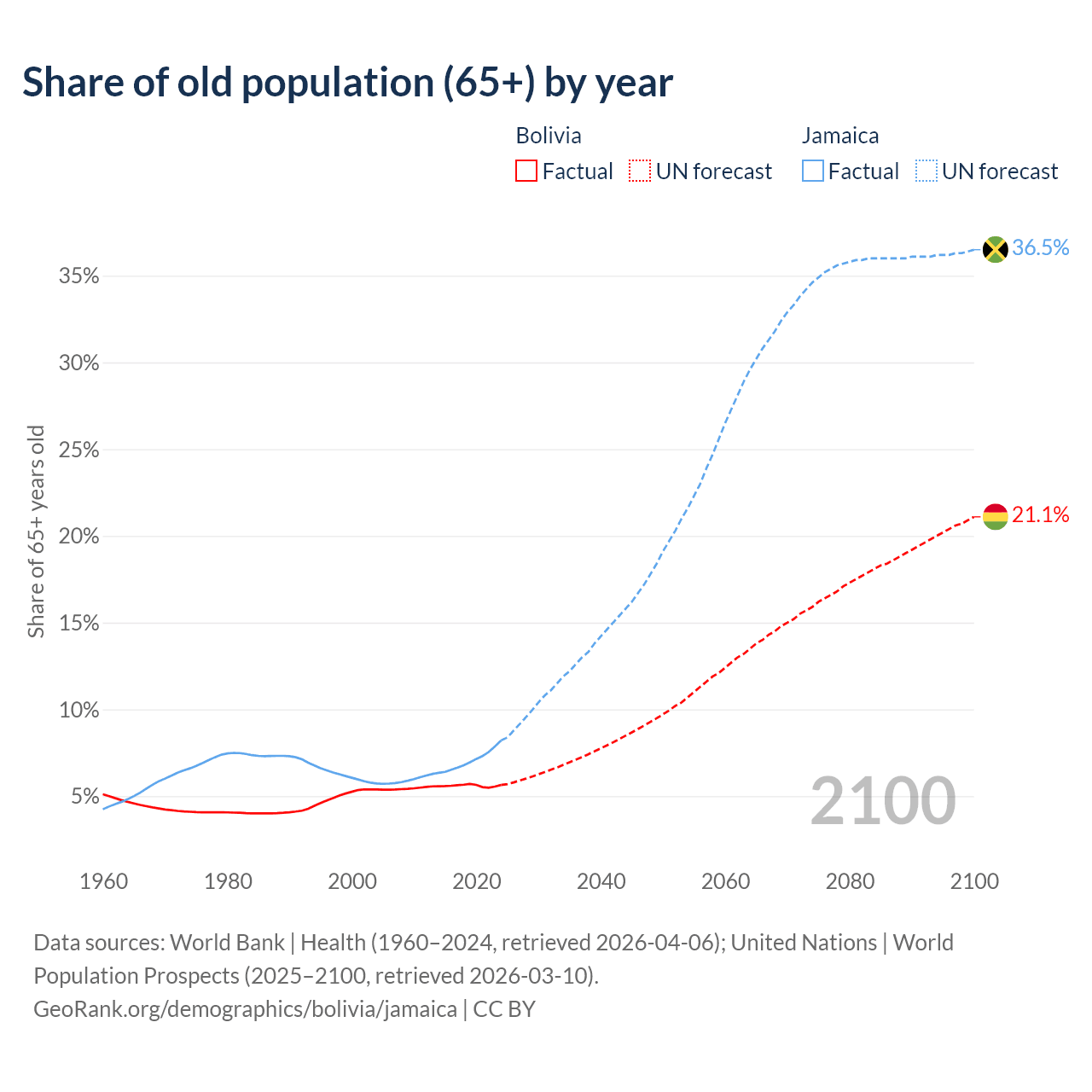 The share of older people aged 65 and over is 5.64% in Bolivia and 8.21% in Jamaica. Life expectancy in Bolivia compared to Jamaica .