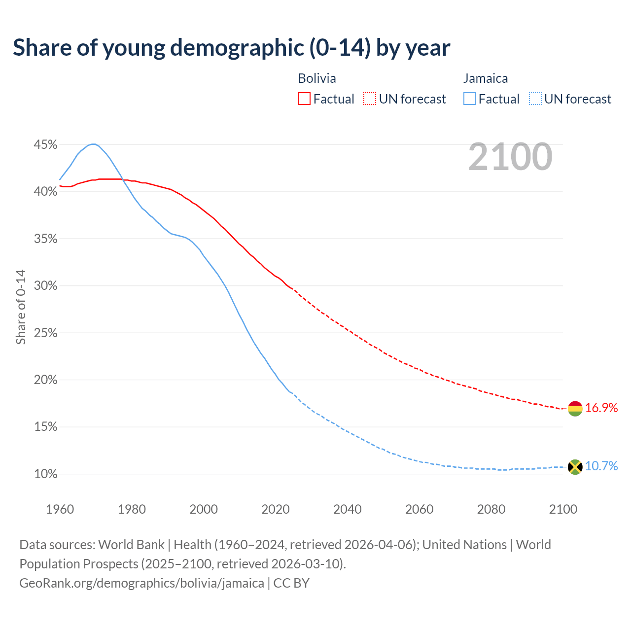 - The share of young demographic (0-15 years old) in Bolivia is 29.8% vs 18.7% in Jamaica.