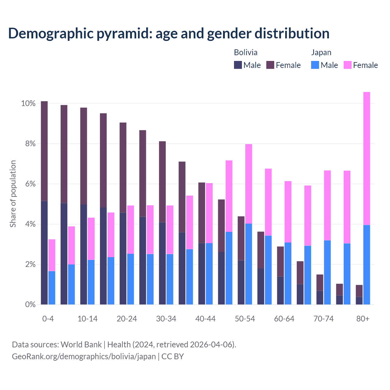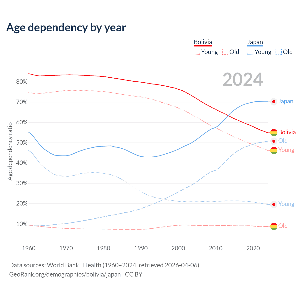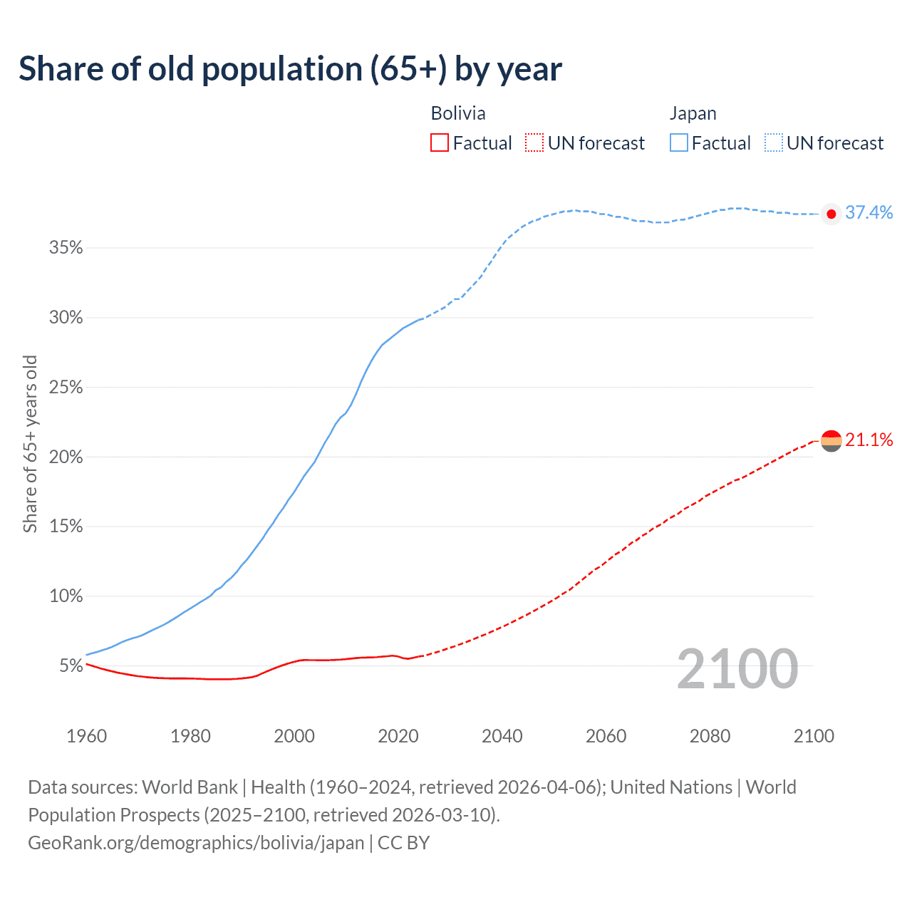 The share of older people aged 65 and over is 5.64% in Bolivia and 29.8% in Japan. Life expectancy in Bolivia compared to Japan .