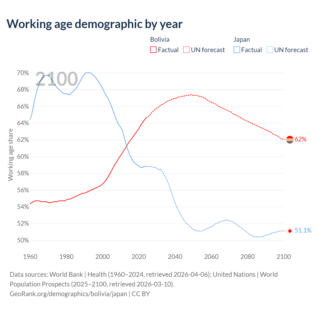 Median age Bolivia vs Japan, 1960-2100