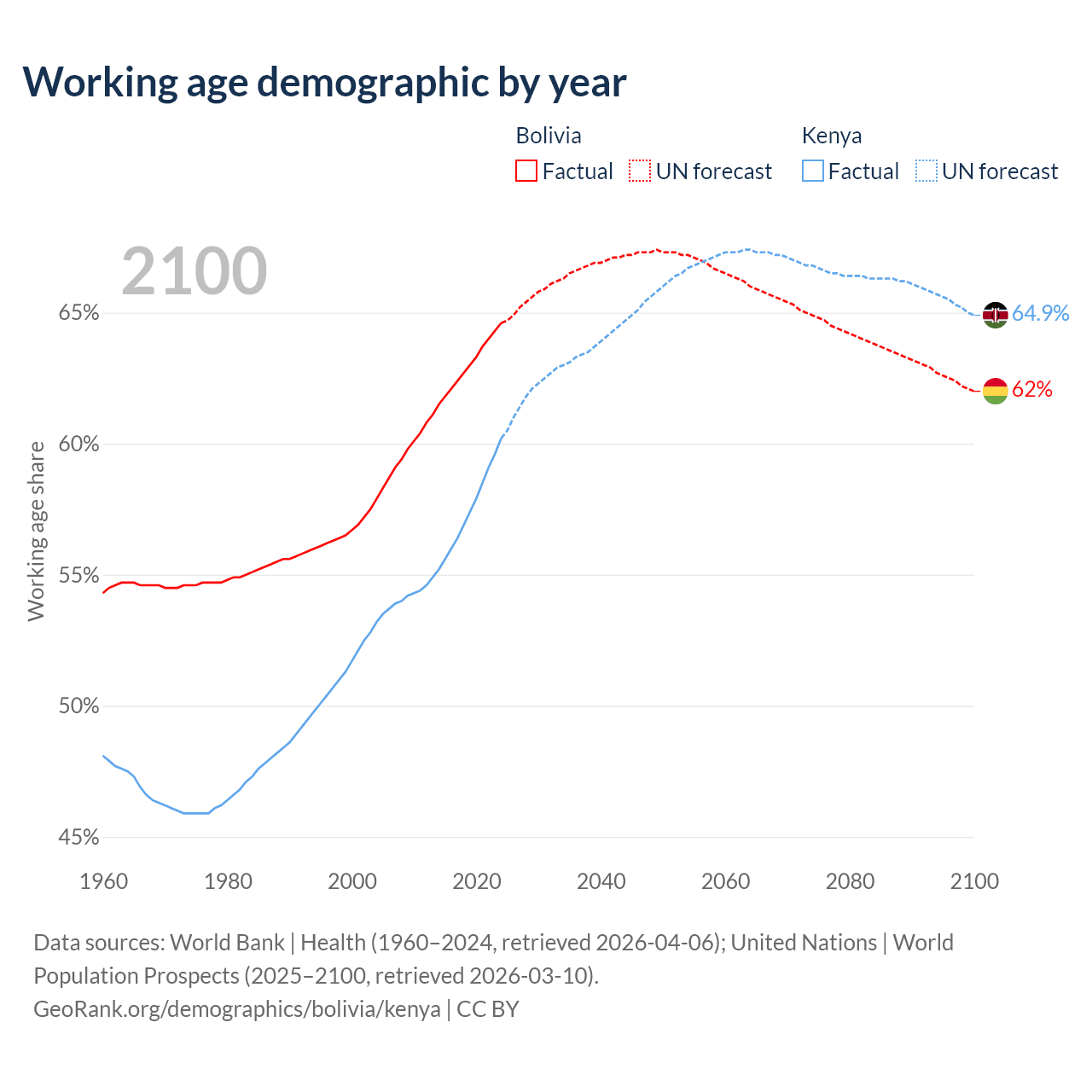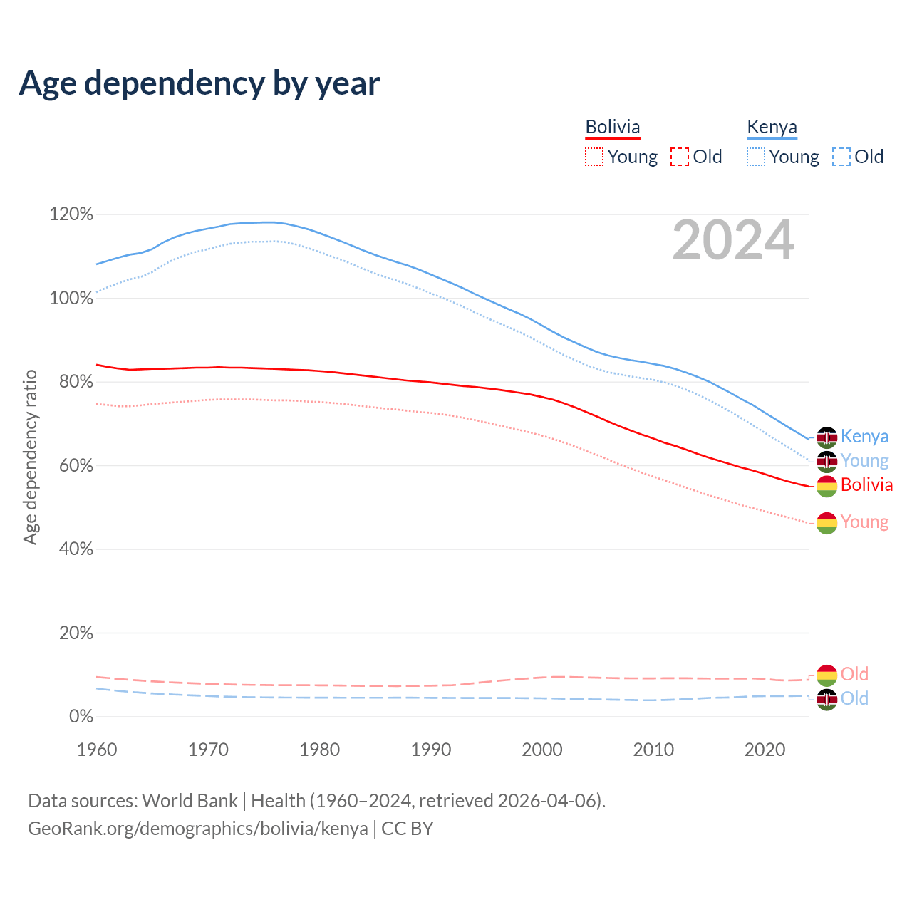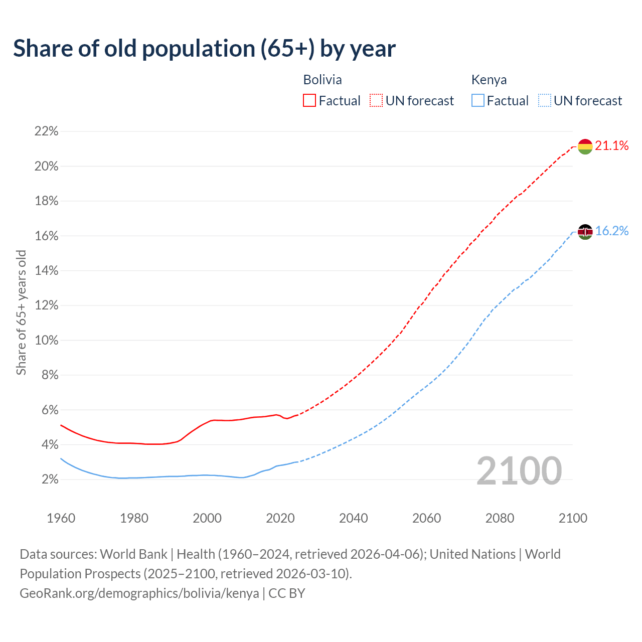 The share of older people aged 65 and over is 5.64% in Bolivia and 2.97% in Kenya. Life expectancy in Bolivia compared to Kenya .
