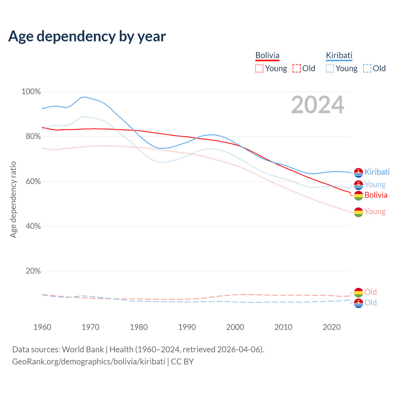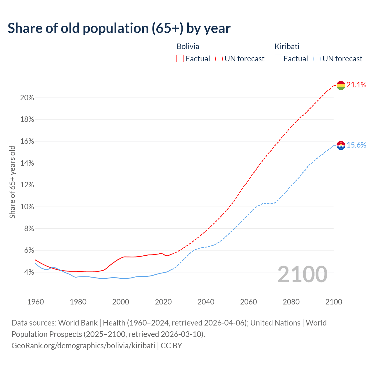 - The share of old-age demographic (65+) in Bolivia is 5.64% vs 4.24% in Kiribati.