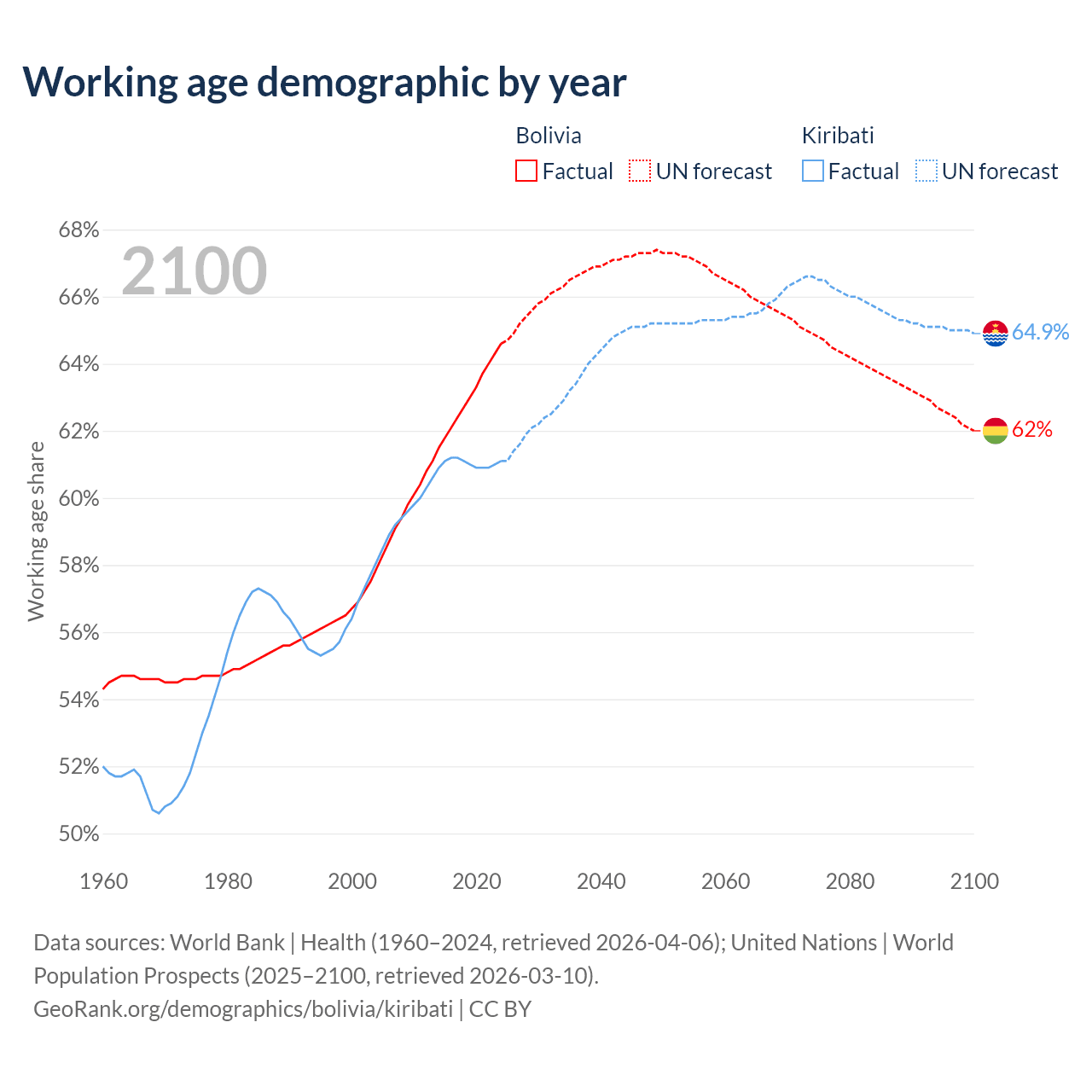 Median age Bolivia vs Kiribati, 1960-2100