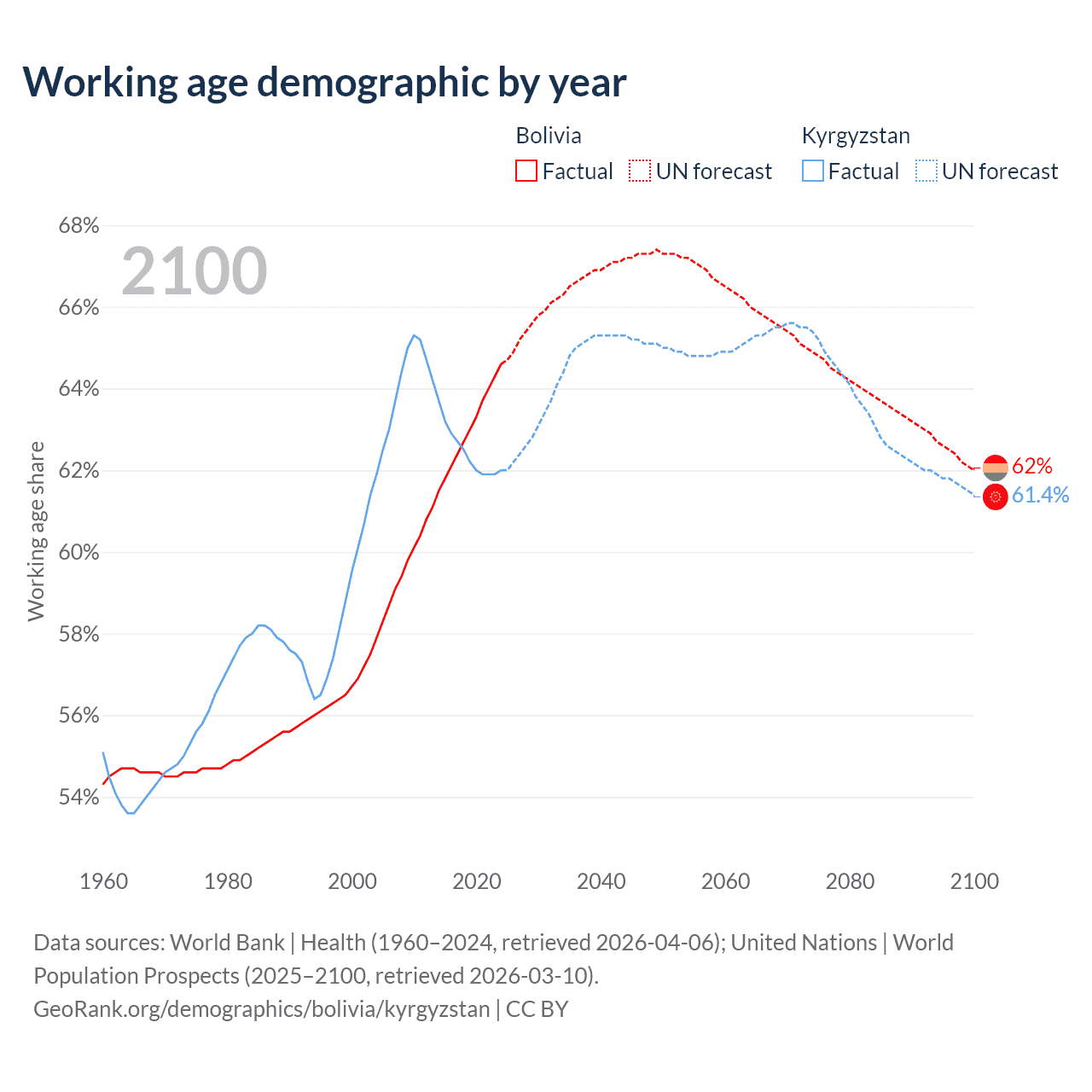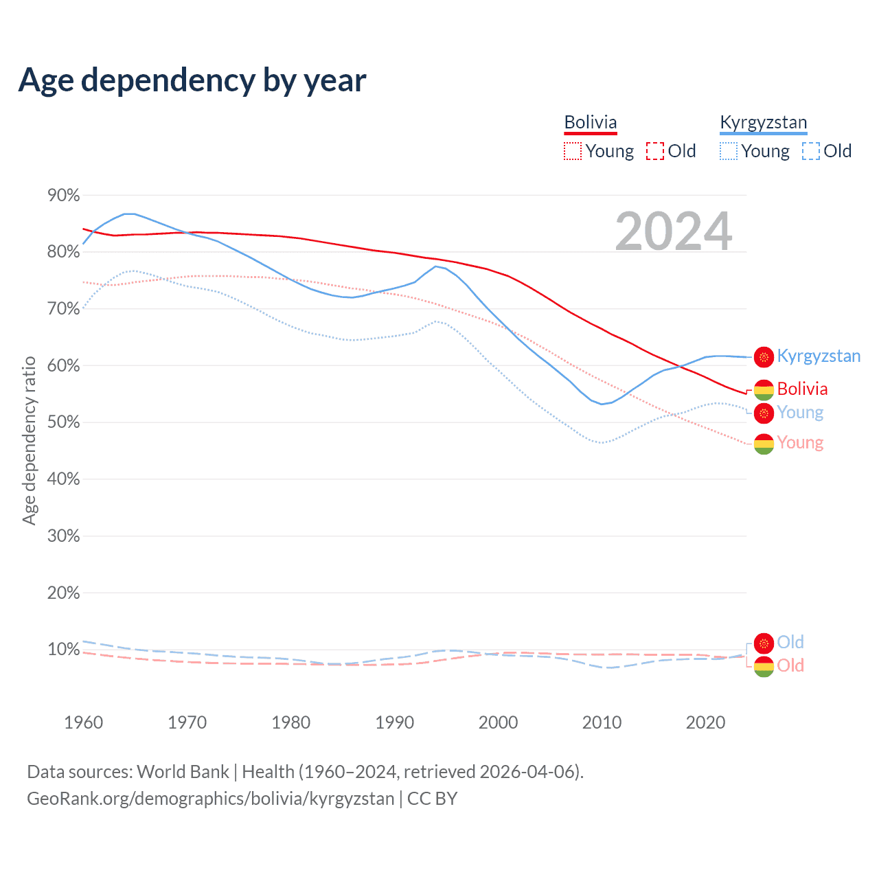 - The share of old-age demographic (65+) in Bolivia is 5.64% vs 5.68% in Kyrgyzstan.