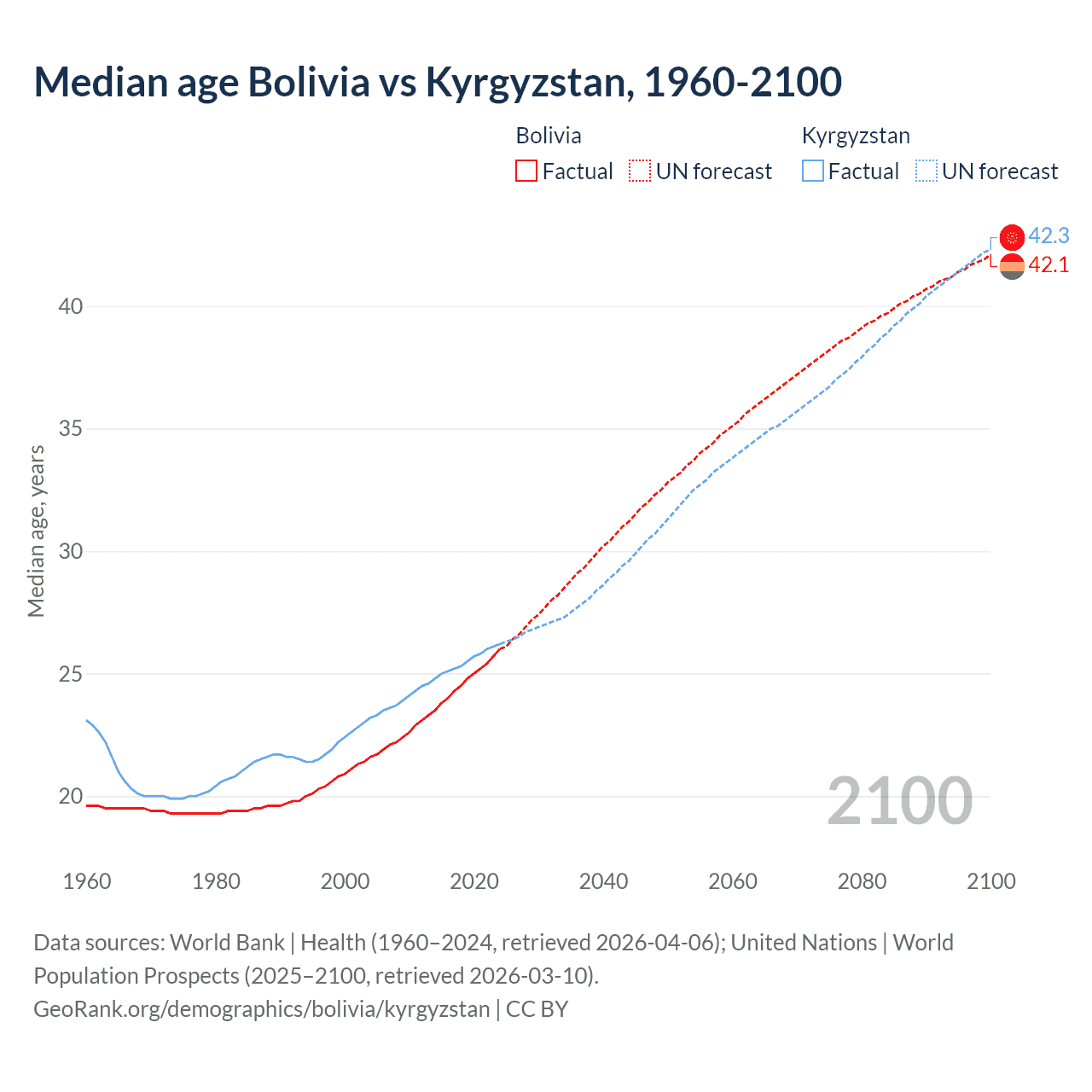 Median age Bolivia vs Kyrgyzstan, 1960-2100