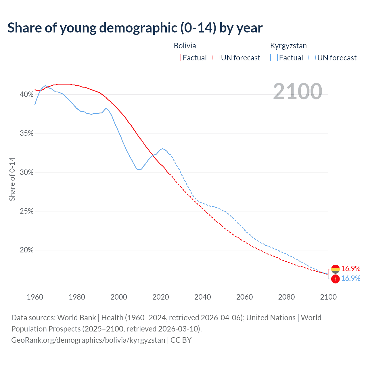 - The share of young demographic (0-15 years old) in Bolivia is 29.8% vs 32.3% in Kyrgyzstan.