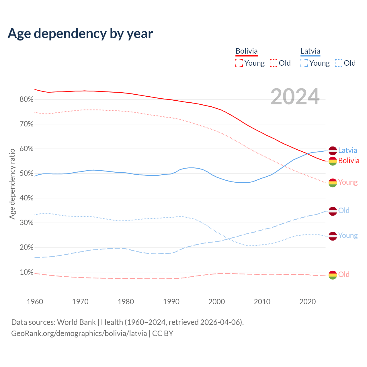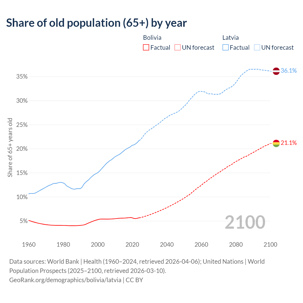 - The share of old-age demographic (65+) in Bolivia is 5.64% vs 21.7% in Latvia.