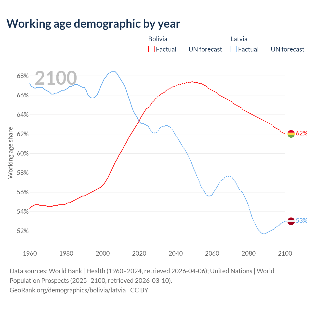 - Bolivia has 8.26M working age adults (aged 15-64) vs 1.15M in Latvia.