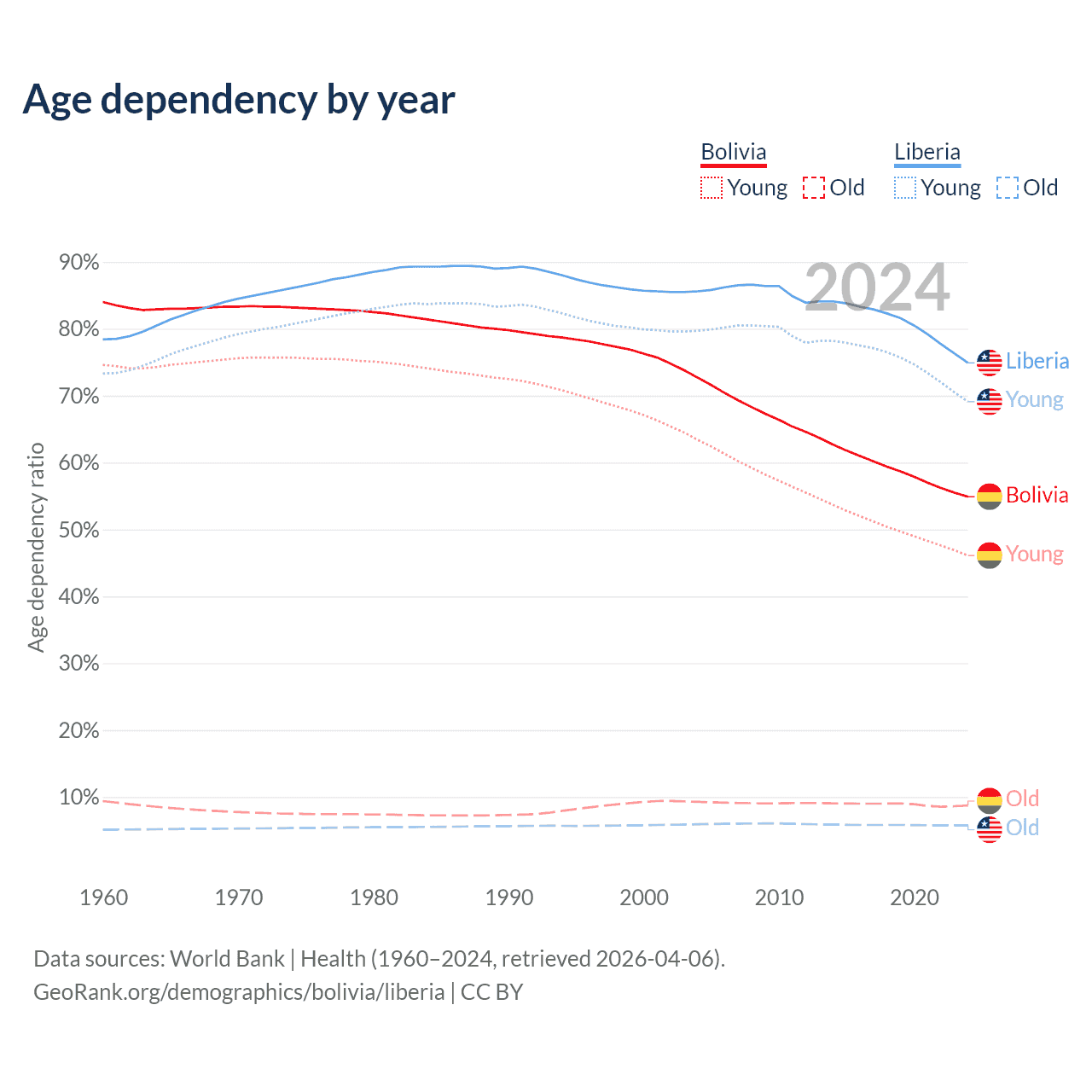 - The share of old-age demographic (65+) in Bolivia is 5.64% vs 3.3% in Liberia.