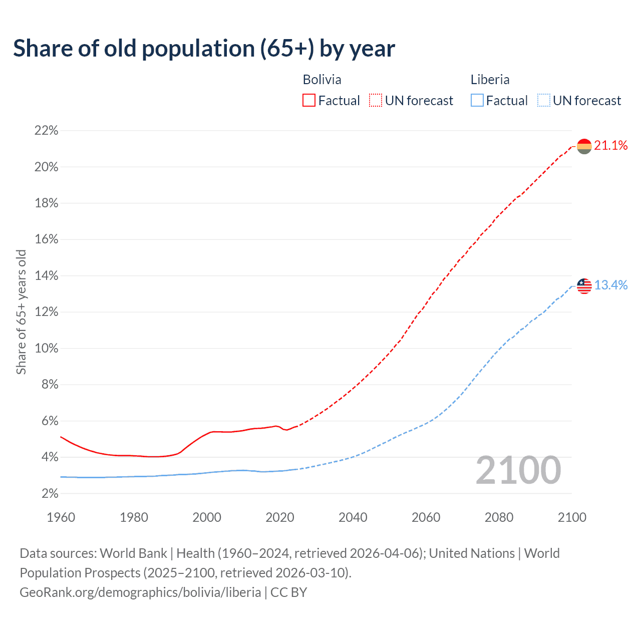The share of older people aged 65 and over is 5.64% in Bolivia and 3.3% in Liberia. Life expectancy in Bolivia compared to Liberia .
