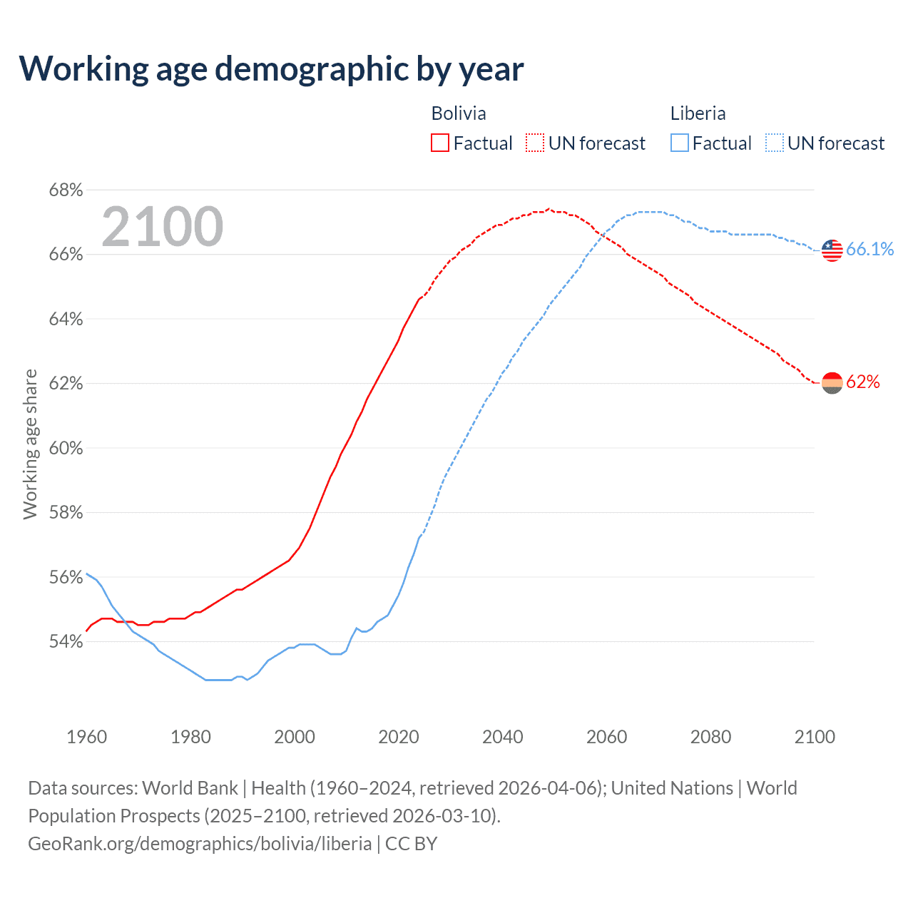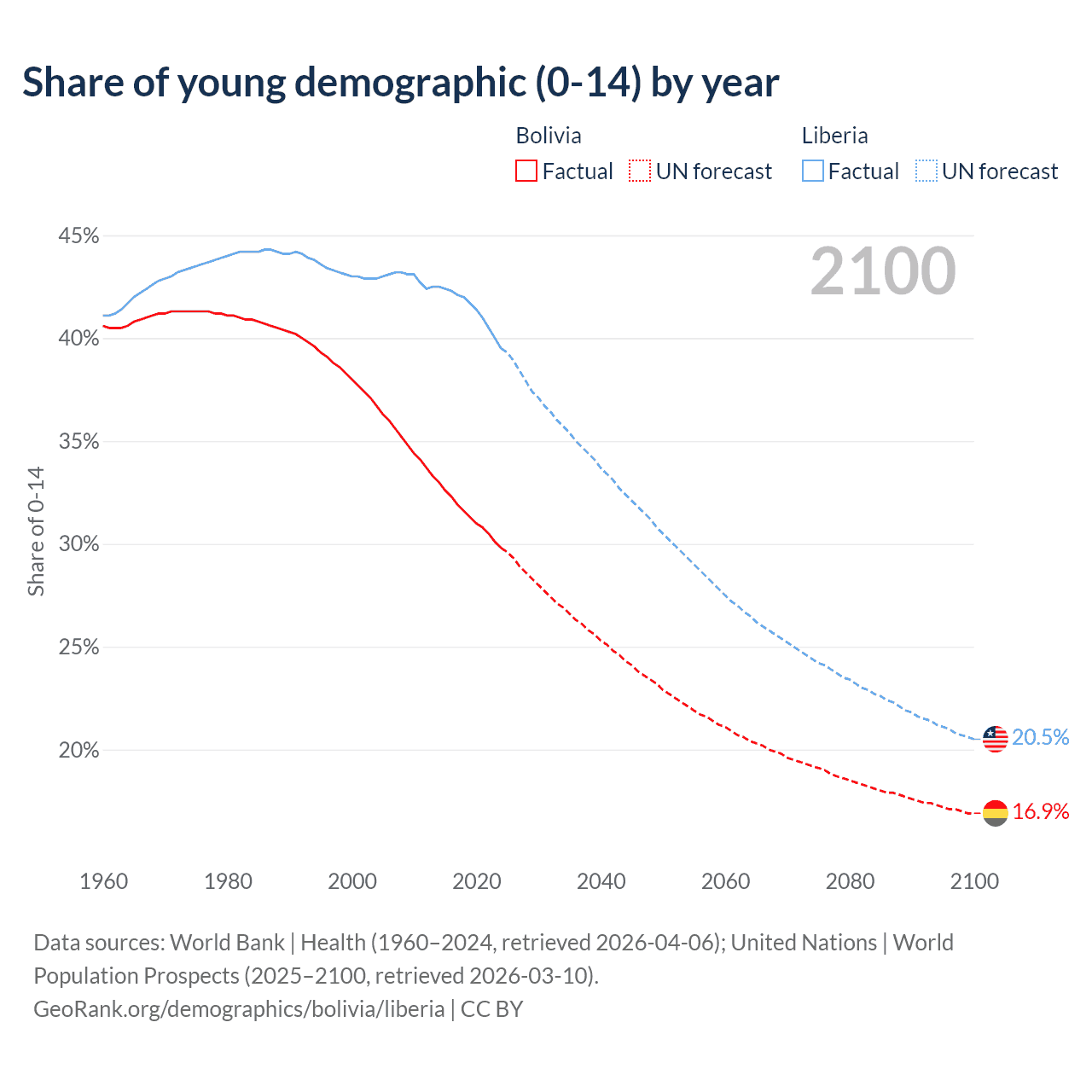Median age Bolivia vs Liberia, 1960-2100