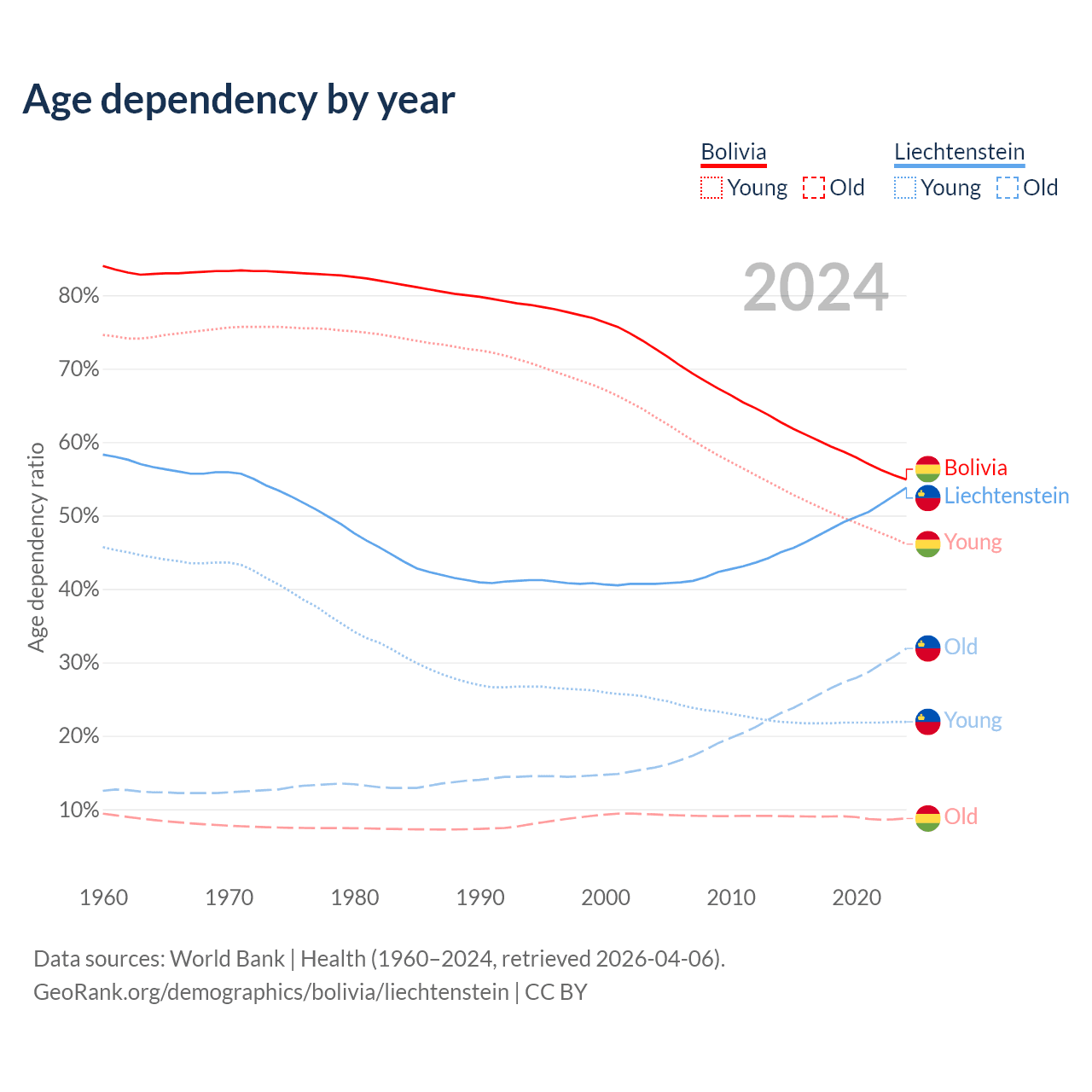 - The share of old-age demographic (65+) in Bolivia is 5.64% vs 20.7% in Liechtenstein.