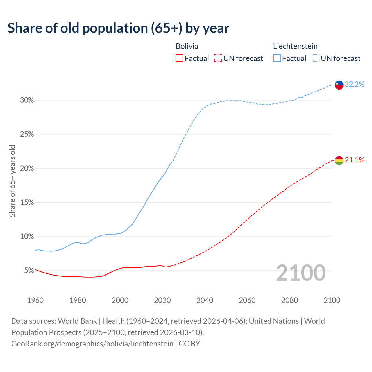 The share of older people aged 65 and over is 5.64% in Bolivia and 20.7% in Liechtenstein. Life expectancy in Bolivia compared to Liechtenstein .