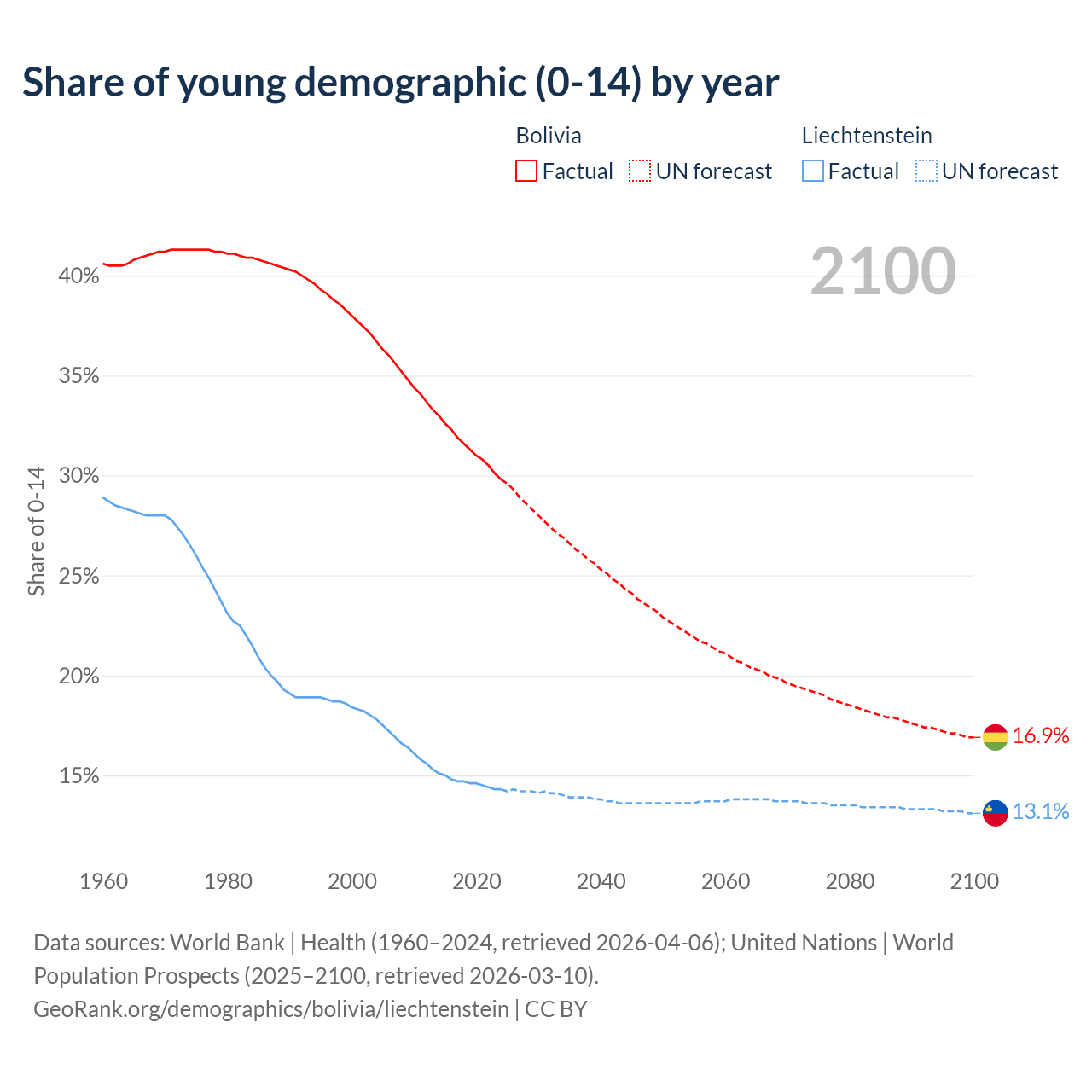 - The share of young demographic (0-15 years old) in Bolivia is 29.8% vs 14.3% in Liechtenstein.