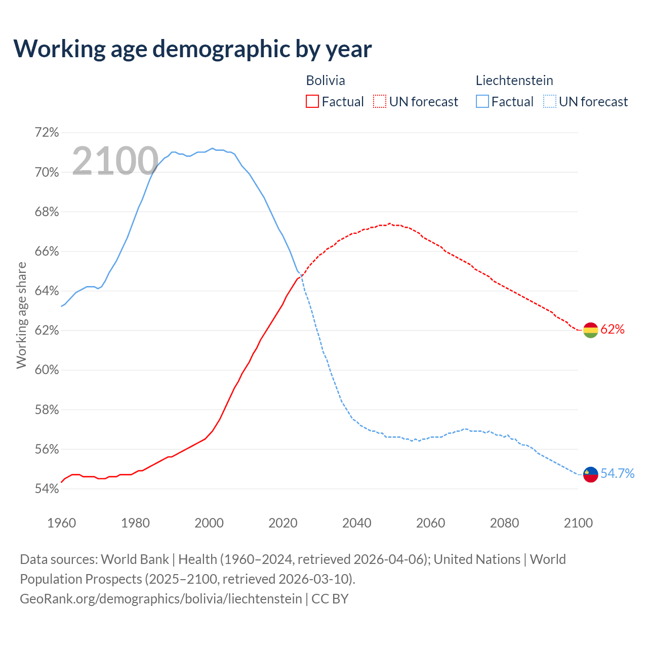 - Bolivia has 8.26M working age adults (aged 15-64) vs 26.7K in Liechtenstein.
