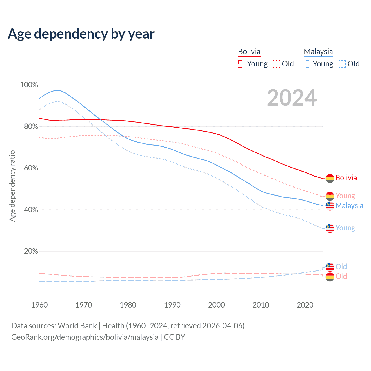 - The share of old-age demographic (65+) in Bolivia is 5.64% vs 7.74% in Malaysia.