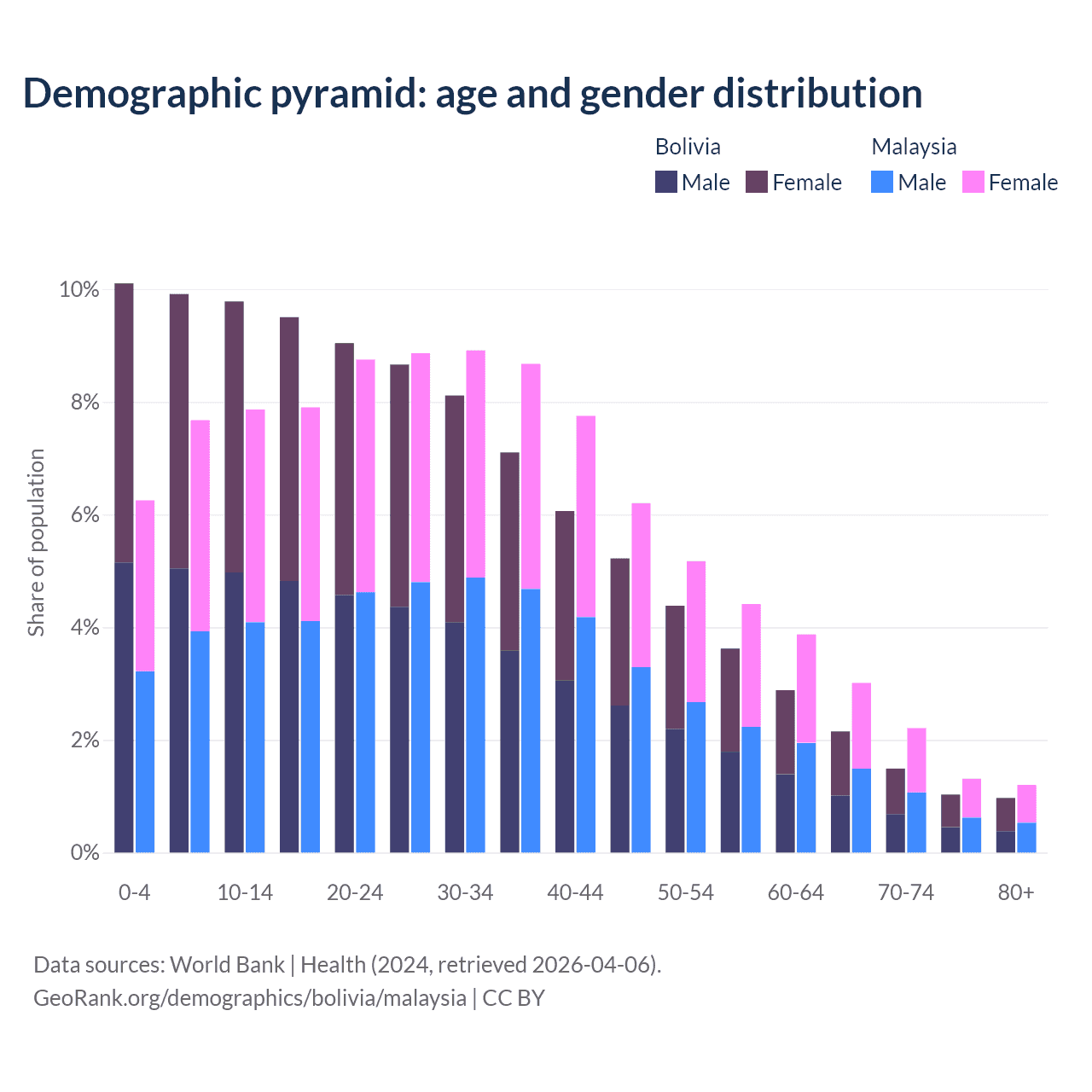 - Bolivia is ranked 128/196 by median age (oldest to youngest) vs 92/196 for Malaysia.