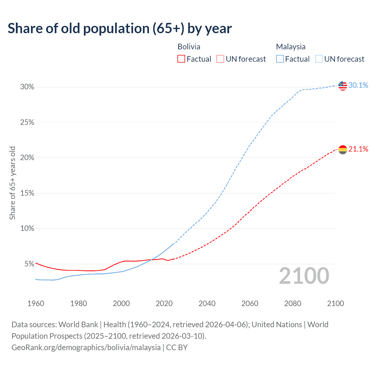 The share of older people aged 65 and over is 5.64% in Bolivia and 7.74% in Malaysia. Life expectancy in Bolivia compared to Malaysia .